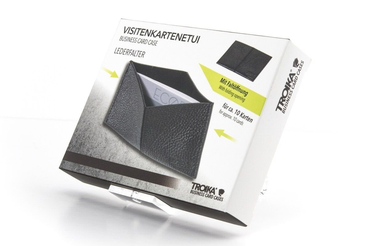 Portofelul este potrivit pentru aproximativ 10 de carti de vizita, dar si pentru alte lucruri: bilete, chitante, carduri etc. Intr-o culoare black business, fabricat din piele naturala, portofelul pentru carti de vizita de la Troika incape usor in buzunar.