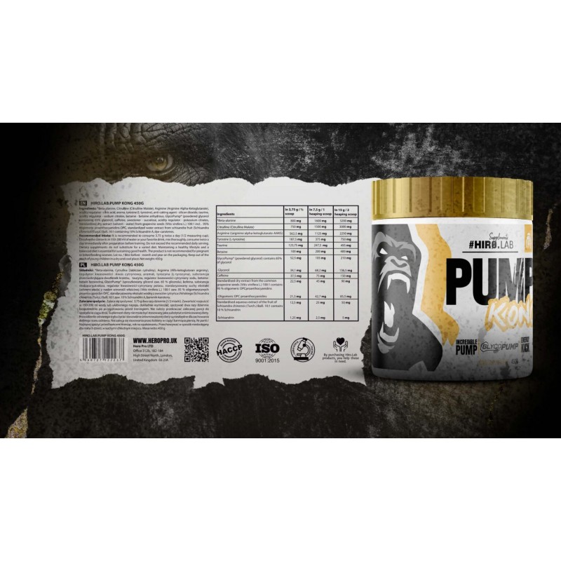 Pump Kong - 450 grame - Bubble Gum, Hiro.Lab Pompă musculară maximă cu formula inovatoare GlycoPump® Energie și rezistență datorită cafeinei, taurinei și unei doze mari de beta-alanină Suport fizic și mental datorită betainei și tirozinei Certificările HACCP și ISO garantează calitatea și siguranța Ingrediente curate, fără contaminanți, testate pentru eficacitate maximă Descoperă puterea unei pompe de neoprit cu Pump Kong! Vrei să-ți duci antrenamentele la nivelul următor? Pump Kong de la Hiro.Lab este un pre-antrenament revoluționar conceput pentru pompare musculară maximă și concentrare completă pe rezultate. Datorită unei formule atent dezvoltate care combină citrulina, arginina și inovatorul GlycoPump®, vei obține un flux sanguin incredibil către mușchi, îmbunătățind oxigenarea și rezistența. Fiecare repetare va deveni mai eficientă, iar mușchii tăi vor lucra la capacitate maximă. Indiferent dacă faci antrenament de forță sau antrenament de anduranță, Pump Kong îți va oferi energia de care ai nevoie pentru a-ți depăși limitele. Du-ți antrenamentul la nivelul următor – încearcă Pump Kong și vezi diferența astăzi! GlycoPump® – tehnologie inovatoare pentru hidratare maximă! Vrei să obții o pompare musculară maximă? GlycoPump™ este o tehnologie revoluționară bazată pe glicerol extrem de concentrat (65%), care crește hidratarea celulelor musculare prin creșterea retenției de apă. Rezultatul? Mușchii tăi devin mai plini și mai fermi, pregătiți pentru exerciții intense. GlycoPump® ajută la menținerea nivelurilor optime de hidratare, chiar și la temperaturi ridicate, iar glicerolul pe care îl conține crește rezistența și performanța, atât în timpul exercițiilor aerobice, cât și anaerobe. Acest ingredient cheie din formula Pump Kong îți permite să-ți duci antrenamentele la nivelul următor, cu rezultate vizibile încă de la prima doză. Dacă vrei să profiți la maximum de fiecare repetare, Pump Kong este soluția de care ai nevoie. Nu există limite! – concentrare completă, rezistență și o pompare constantă! Apelează la Pump Kong, iar fiecare antrenament va deveni o plăcere pură. Datorită combinației de cafeină și taurină, vei simți un impuls imediat de energie care îți va stimula corpul și mintea. După o singură doză, veți observa o îmbunătățire - concentrația maximă, iar oboseala va dispărea. În plus, beta-alanina și citrulina vă vor crește rezistența, întârziind apariția oboselii, permițând sesiuni de antrenament mai lungi și mai eficiente. Și dacă vă doriți o creștere constantă a mușchilor pe care alții o vor invidia, inovatorul GlycoPump® vă va ridica performanța la noi culmi. Pump Kong este arma secretă pentru oricine dorește să își depășească limitele și să bată recorduri - antrenament după antrenament. Indiferent de etapa în care vă aflați, cu Pump Kong, nu există limite. Doar cea mai înaltă calitate La Hiro.Lab, siguranța și transparența dumneavoastră sunt prioritatea noastră. Certificările HACCP și ISO sunt dovada angajamentului nostru de a produce suplimente de cea mai înaltă calitate. Fiecare lot de Pump Kong este supus unor inspecții riguroase, de la selecția materiilor prime până la produsul finit. Marcajul „Testat în laborator” confirmă faptul că produsul a fost testat independent pentru compoziția sa și absența metalelor grele, a contaminării microbiologice și a substanțelor interzise - puteți găsi testul complet aici. Cu Pump Kong, vă puteți atinge obiectivele în siguranță și într-un mod complet controlat. Alătură-te unei lumi în care calitatea și siguranța merg mână în mână cu putere nelimitată! #DezlănțuiePomparea Ingrediente Porție: 3,75 g Porții per recipient: 120 Pachet: 450 g Ingrediente Pump Kong: beta-alanină, citrulină (malat de citrulină), arginină (alfa-cetoglutarat de arginină), regulator de aciditate – acid citric, aromă, tirozină (l-tirozină), agent antiaglomerant – dioxid de siliciu, taurină, regulator de aciditate – citrați de sodiu, betaină anhidră, GlycoPump® (glicerol pudră conținând 65% glicerol), cafeină, îndulcitor – sucraloză, regulator de aciditate – citrați de potasiu, extract uscat standardizat (solvent-apă) din semințe de struguri (Vitis vinifera L.) 100:1 conținând 95% proantocianidine oligomerice OPC, extract apos standardizat de Schisandra chinensis (Schisandra chinensis (Turcz.) Baill.) 10:1, conținând 10% Schisandrin A, colorant – caroteni. Supliment alimentar. Acest produs nu este destinat diagnosticării, tratării, vindecării sau prevenirii vreunei boli. Ingrediente Porție: 3,75 g Porții per recipient: 120 Pachet: 450 g Ingrediente Pump Kong: beta-alanină, citrulină (malat de citrulină), arginină (alfa-cetoglutarat de arginină), regulator de aciditate – acid citric, aromă, tirozină (l-tirozină), agent antiaglomerant – dioxid de siliciu, taurină, regulator de aciditate – citrați de sodiu, betaină anhidră, GlycoPump® (glicerol pudră conținând 65% glicerol), cafeină, îndulcitor – sucraloză, regulator de aciditate – citrați de potasiu, extract uscat standardizat (solvent-apă) din semințe de struguri (Vitis vinifera L.) 100:1 conținând 95% proantocianidine oligomerice (OPC), extract apos standardizat de fructe Schisandra chinensis (Turcz.) Baill. 10:1 conținând 10% Schisandrin A, colorant – caroteni. Supliment alimentar. Acest produs nu este destinat diagnosticării, tratării, vindecării sau prevenirii vreunei boli. Ingrediente Per 3,75 g / ½ linguriță Per 7,5 g / 1 linguriță cu vârf Per 15 g / 2 lingurițe cu vârf Beta-alanină 800 mg / 1600 mg / 3200 mg Citrulină (Malat de citrulină) 750 mg / 1500 mg / 3000 mg Arginină (Alfa-cetoglutarat de arginină - AAKG) 562,5 mg / 1125 mg / 2250 mg Tirozină (L-Tirozină) 187,5 mg / 375 mg