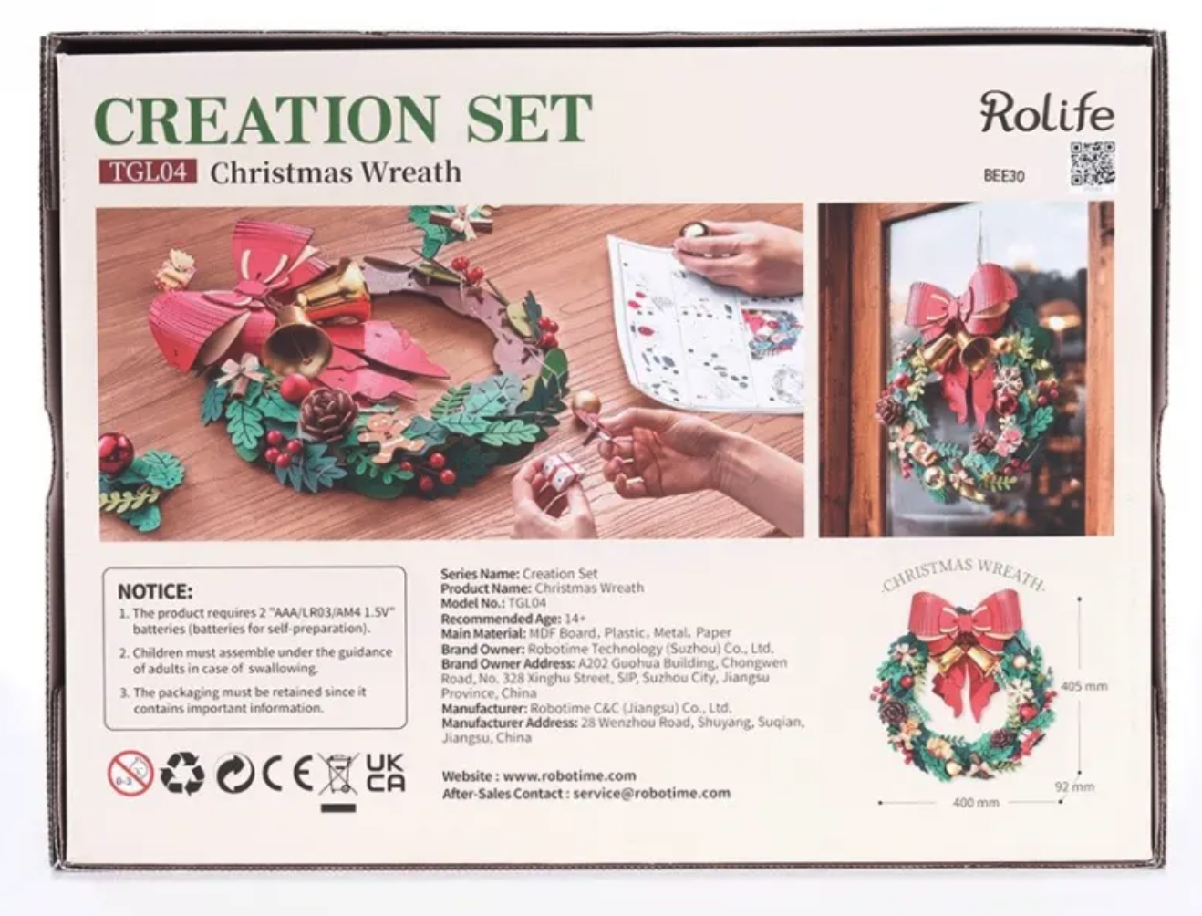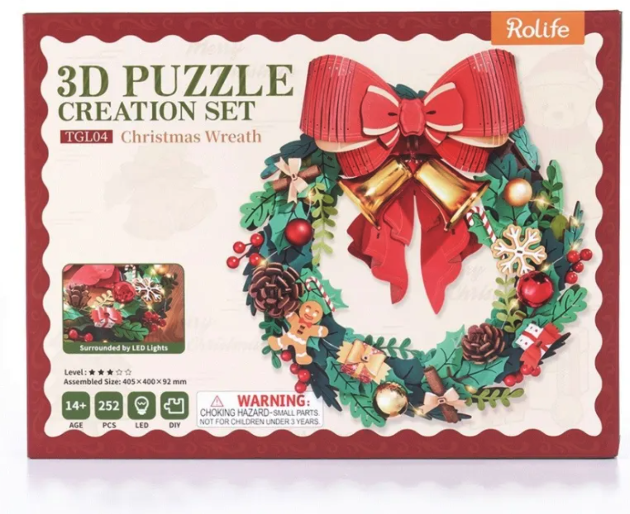 Puzzle 3D 252 piese - Christmas WreathConstruieste-ti propria coroana de Craciun – un proiect DIY magic din lemn de la RobotimeIn nuante de rosu, auriu si verde – culorile clasice ale Craciunului!Globuri stralucitoare in rosu intens si auriu cald, unele cu luciu metalic, altele cu un finisaj mat elegant — exact cum ar trebui sa arate o coroana de Craciun de vis!Printre ele atarna clopotei aurii si conuri de brad, iar betisoarele de scortisoara (da, tot din lemn!) sunt legate cu fundite delicate.Bobitele rosii adauga o nota jucausa, in timp ce cadourile miniaturale cu panglici si fulgii de zapada completeaza perfect scena.In varful coroanei troneaza o mare funda rosie, demna de o scena de film de Craciun!Construieste-ti singur aceasta coroana de Craciun cu kitul din lemn RobotimeAceasta coroana DIY de Craciun de la Robotime se construieste pe straturi, oferind o experienta creativa relaxanta si plina de satisfactii.Piesele sunt fabricate din lemn de inalta calitate, taiate cu laser cu precizie si livrate pe placi preformate — trebuie doar sa le desprinzi usor cu degetele.Datorita decupajelor inteligente, poti chiar indoi anumite forme, cum ar fi funda decorativa.Toate componentele se asambleaza usor prin clic, fara a fi nevoie de lipici.Constructia este o activitate relaxanta si inspiranta, perfecta pentru o zi de Craciun in familie sau pentru un moment de calm creativ.Rezultatul? O piesa decorativa de exceptie, de care te vei bucura ani la rand.Dimensiuni finale: 40 cm diametru × 9 cm adancimeRosu, verde si auriu — culorile care incalzesc sufletul de sarbatoriDaca inca mai ai pofta de creativitate de Craciun, exploreaza si celelalte proiecte festive Robotime:Creeaza Christmas Street, un „book nook” fermecator cu lumini LED, perfect intre volumele tale preferate.Construieste Christmas Candy Stand, o casuta dulce in miniatura pentru pervazul ferestrei.Sau da viata unor tablouri 3D de iarna, adevarate scene artistice care transforma Craciunul intr-o poveste vizuala.Toate in acelasi stil cald, nostalgic si plin de farmec, care face ca acest sezon sa fie cu adevarat special.Fa-ti casa sa straluceasca cu decorul tau de Craciun facut manual!Adauga o nota personala sarbatorilor si bucura-te de satisfactia de a crea ceva frumos cu mainile tale.Cu Robotime, fiecare proiect devine o amintire — o bucata din magia Craciunului, construita chiar de tine.