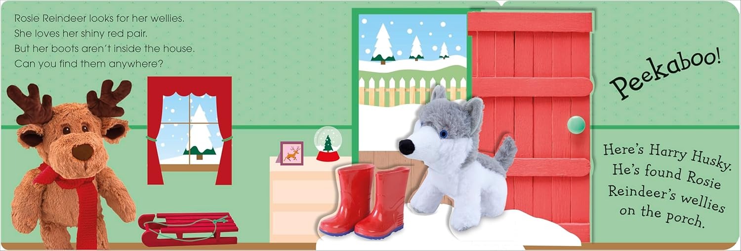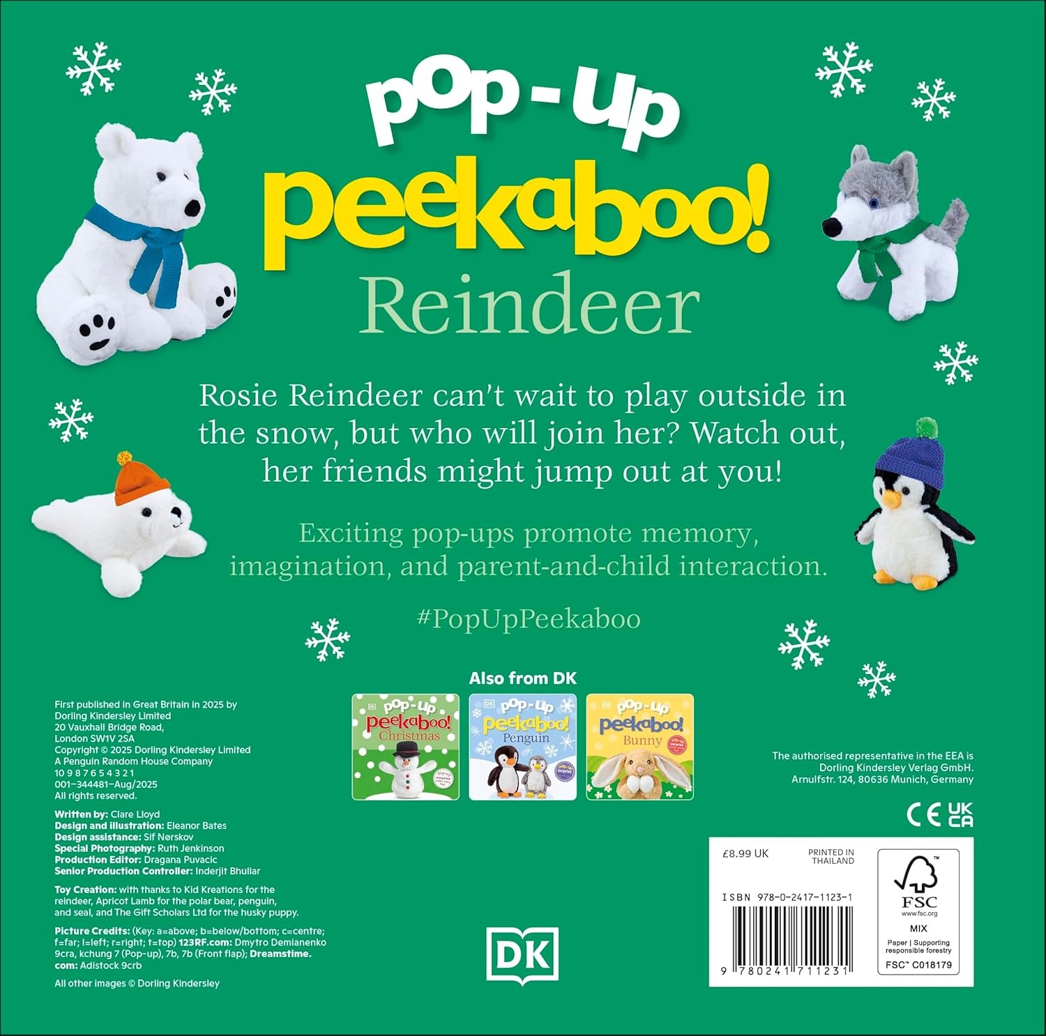 An interactive board book with hidden reindeer and winter animal surprises along with way! Tactile elements and delightful imagery will encourage the development of motor skills and early learning.Babies and toddlers will love lifting the big flaps to find five peekaboo surprises pop up from the pages, including Parker Polar Bear and Percy Penguin, making this board book a fun and easy story about winter animals.Pop-up Peekaboo! Reindeer provides lots of opportunities for parent-and-child interaction and hours of wintry fun. Journey through the snow and watch as a Rosie Reindeer finds each of her friends, wraps up warm and puts on her favourite boots.This winter pop-up book for 3-5 year olds includes:Hands-on play elements that build all-round learning skills.5 flaps throughout the book to lift and find the pop-ups, helping to develop fine motor skills.Rhythmic, read-aloud text that aids language development.Rounded edges and chunky board book pages rigorously tested (and chewed) by toddlers.This pop-up book contains read-aloud text which creates an amusing story for your kids to follow and play a guessing game of who’s behind the flap! The rhymes and the easy-to-read text help little ones remember the new words they are learning for early language development.Why not collect the Pop-Up Peekaboo! series?The peekaboo fun doesnt stop here! Your little one will enjoy hide-and-seek surprises with the My Pop-Up series. Find your farmyard friends with Pop-Up Peekaboo! Farm, search the oceans in Pop-Up Peekaboo! Under the Sea, travel back in time to find dinosaurs in Pop-up Peekaboo! Baby Dinosaur and more!