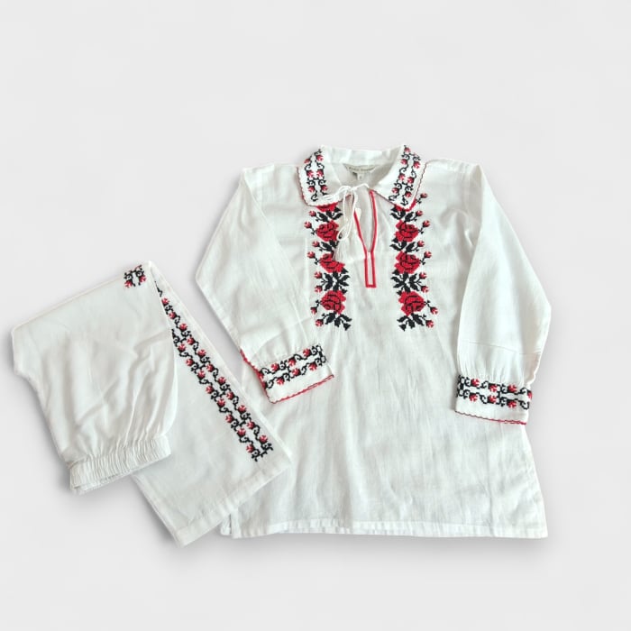 Material: bumbac 100%. Broderie cusuta la masina Culoare: alb cu broderie multicolora. Marimi disponibile: S , 105cm circumferinta bustului, 110cm sold, 90cm lungime, M , 110cm circumferinta bustului, 115cm sold,90cm lungime, L , 115cm circumferinta...
