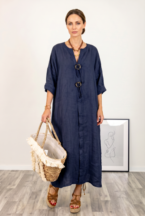 Maneca 3 4 ce se poate ridica si prinde cu un nasturel Decolteu in V Are buzunare laterale ascunse Material: In Este talie unica si se potriveste marimilor: M, L si XL, 2XL Dimensiuni: umeri 46 cm, bust 116 cm, lungime 118 cm Modelul are 172 cm inaltime...