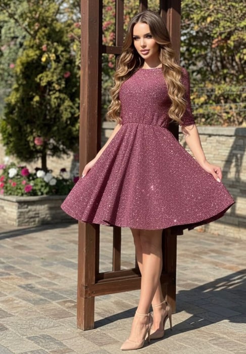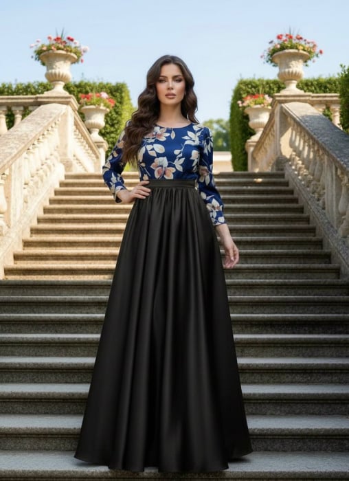 Rochie traditionala midi de culoare rosu, din bumbac, cu broderie cu modele traditionale florale. Decolteu rotund si maneci 3 4. Este prevazuta cu jupa.