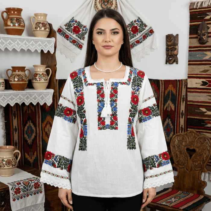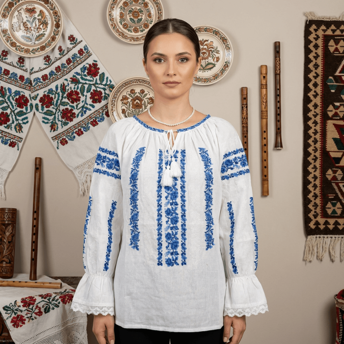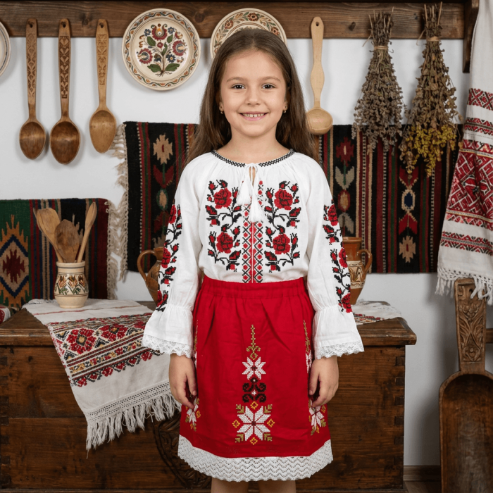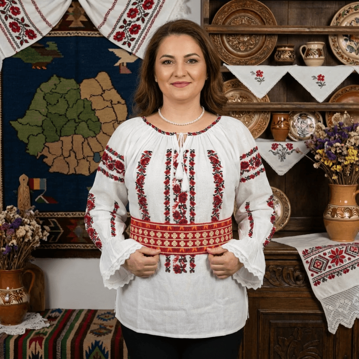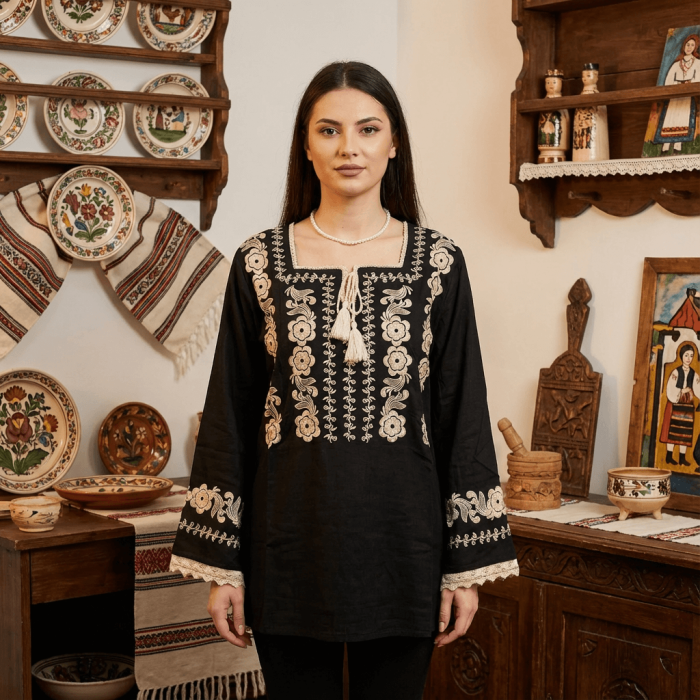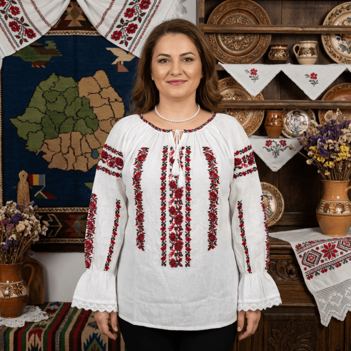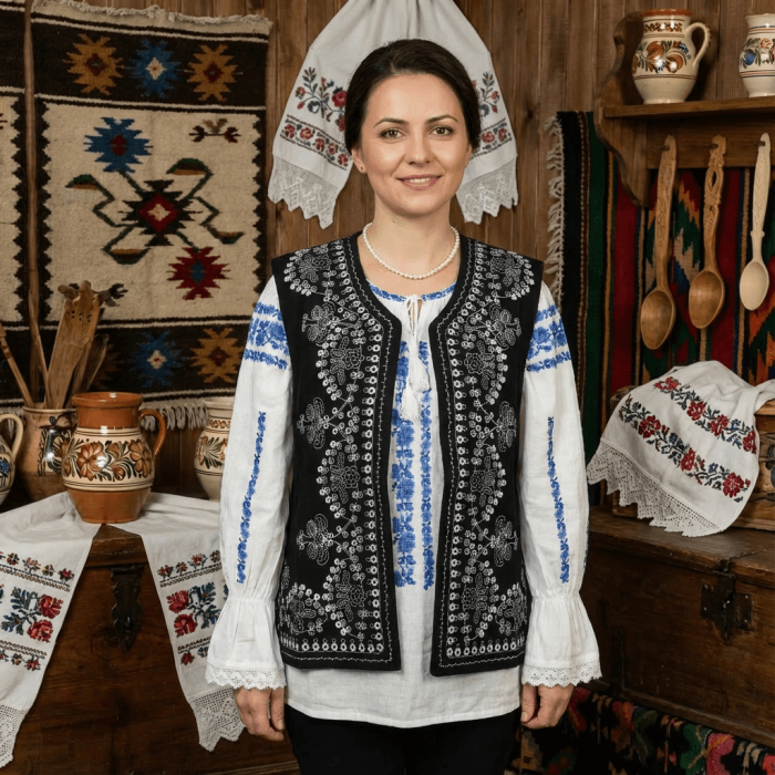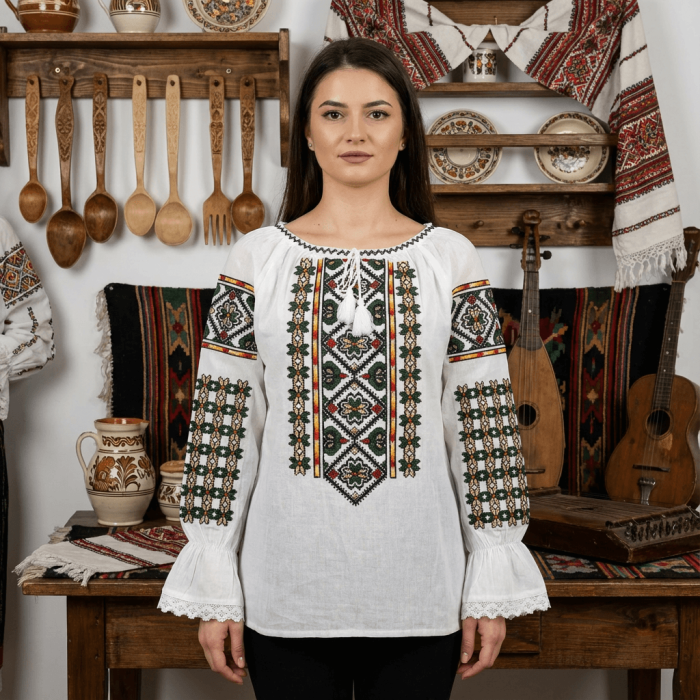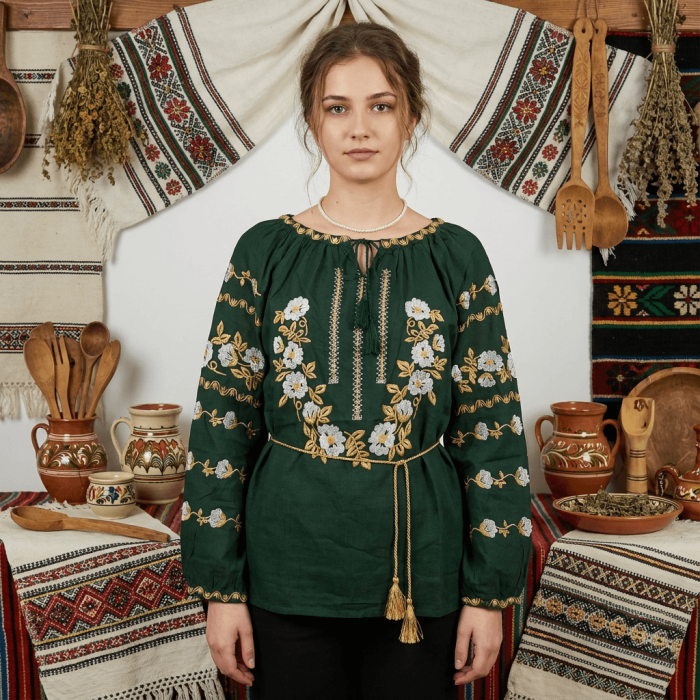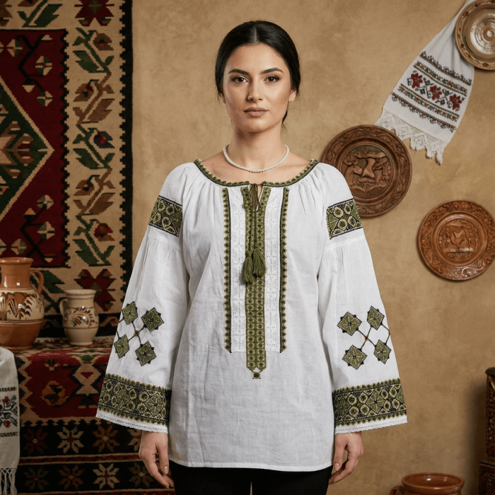 Rochia traditionala ,de culoare verde, croi drept, cu broderie plina, cu motive florale,, iar decolteul este in rotund. Manecile sunt lungi, iar broderia traditionala o regasim atat pe bust cat si pe tiv si la baza rochiei si a manecilor. Este prevazuta...