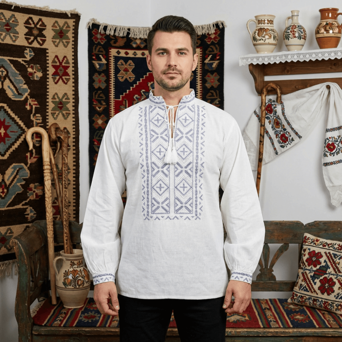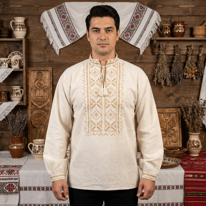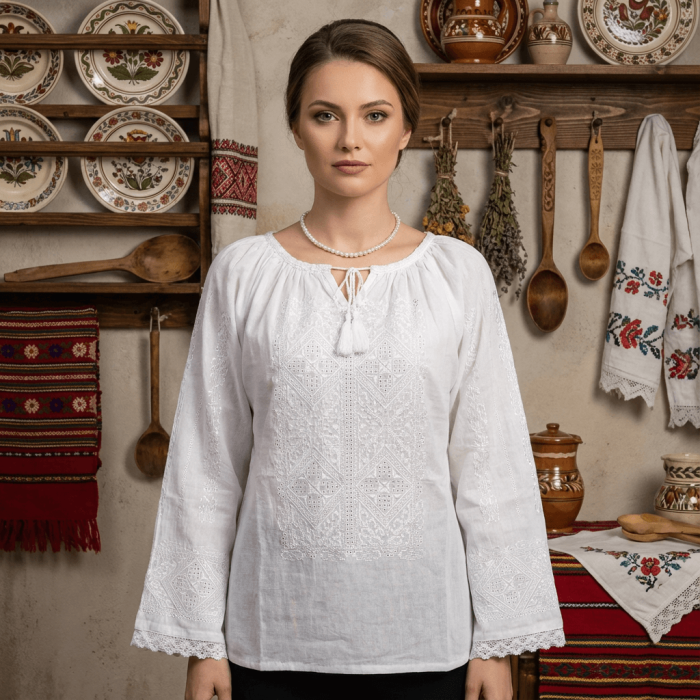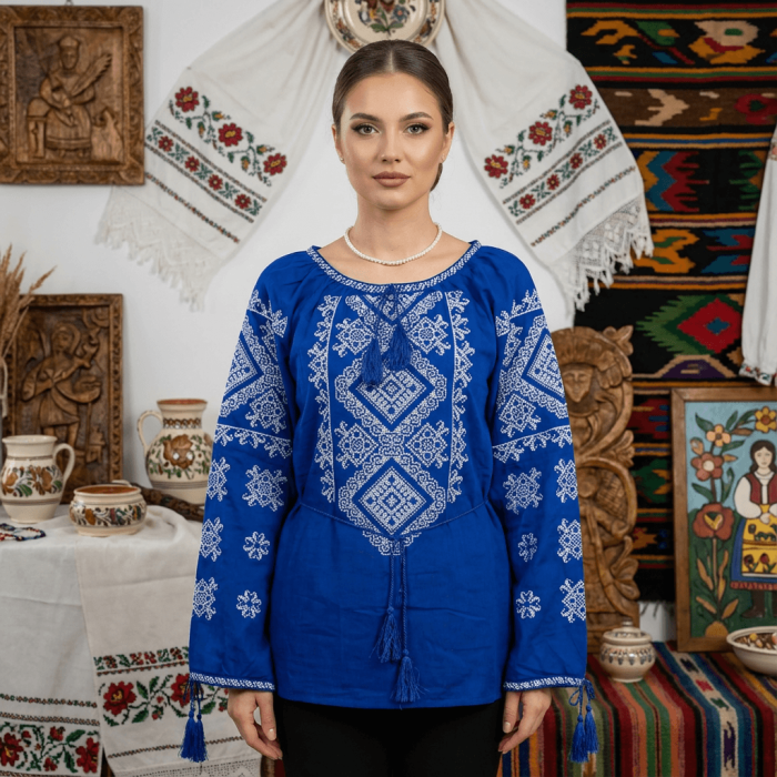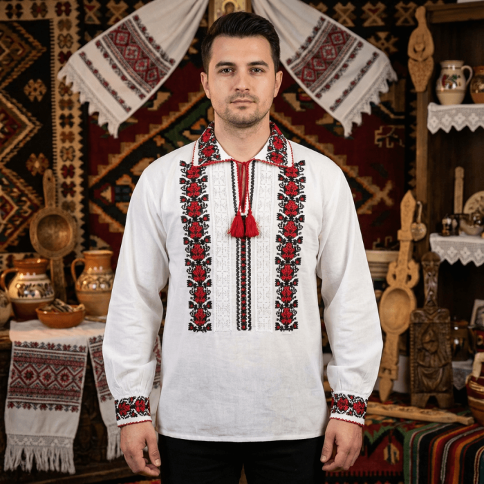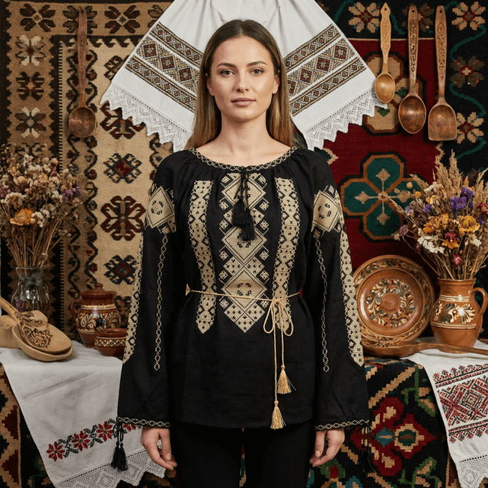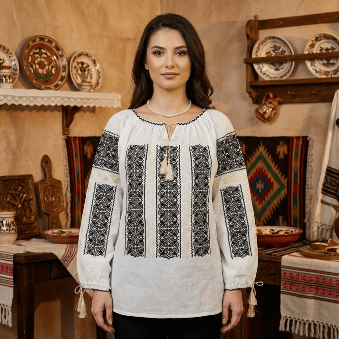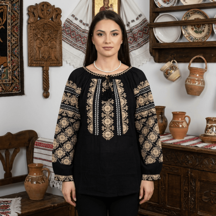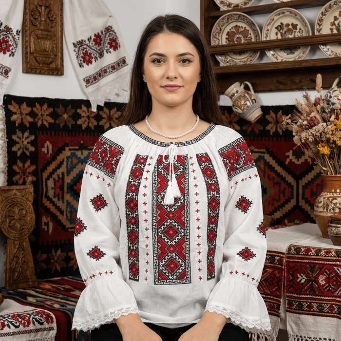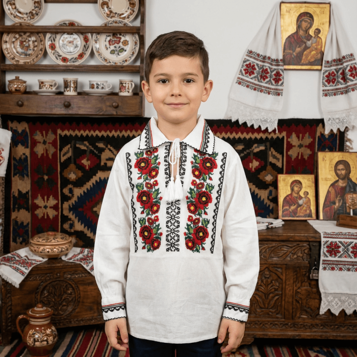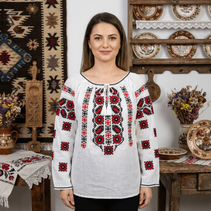 Rochia traditionala ,de culoare verde, croi drept, cu broderie plina, cu motive florale,, iar decolteul este in rotund. Manecile sunt lungi, iar broderia traditionala o regasim atat pe bust cat si pe tiv si la baza rochiei si a manecilor. Este prevazuta...
