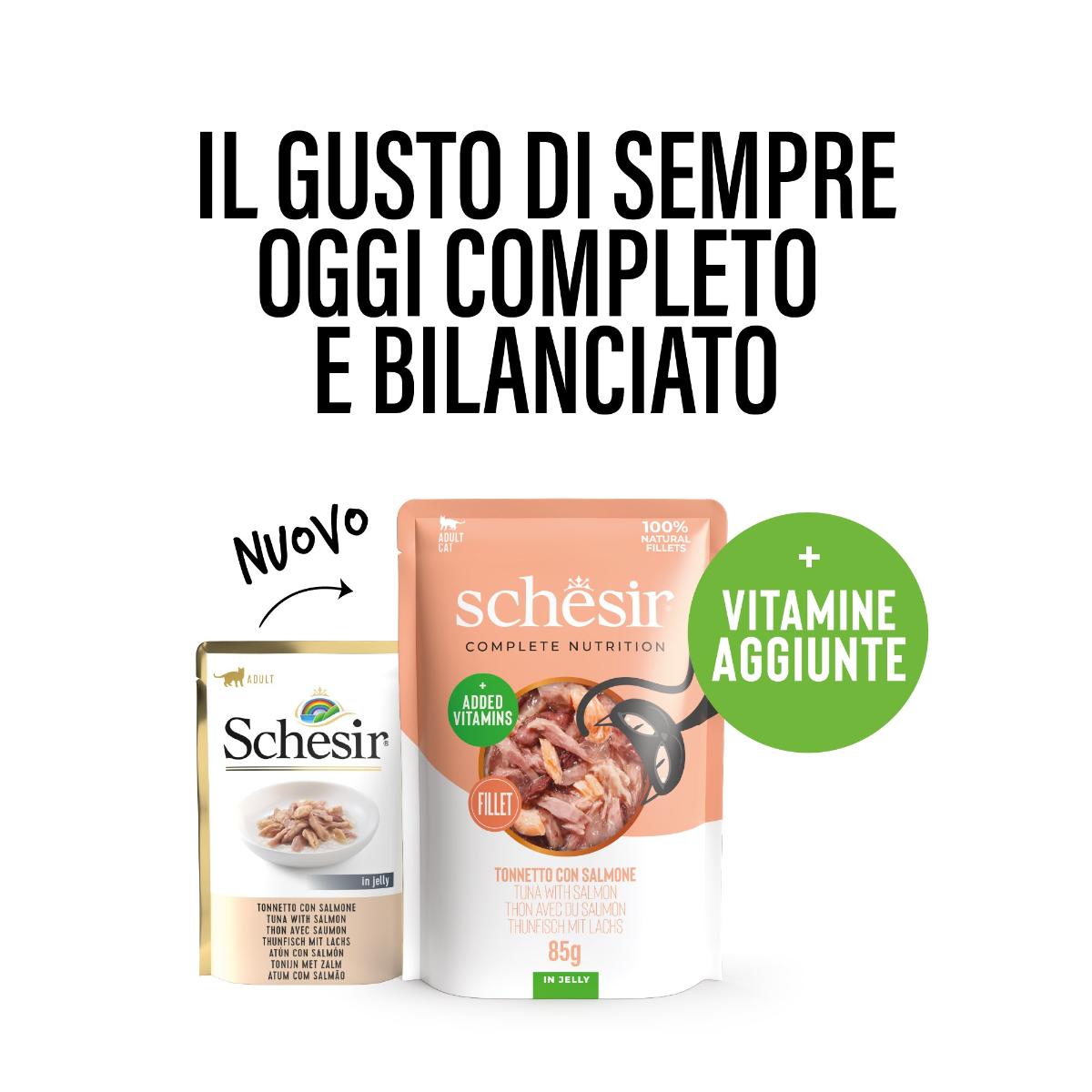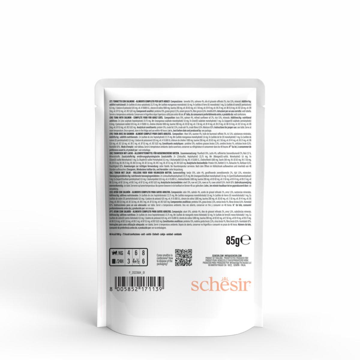 SCHESIR Complete Nutrition, Ton și Somon, plic hrană umedă pisici, (în aspic), 85g