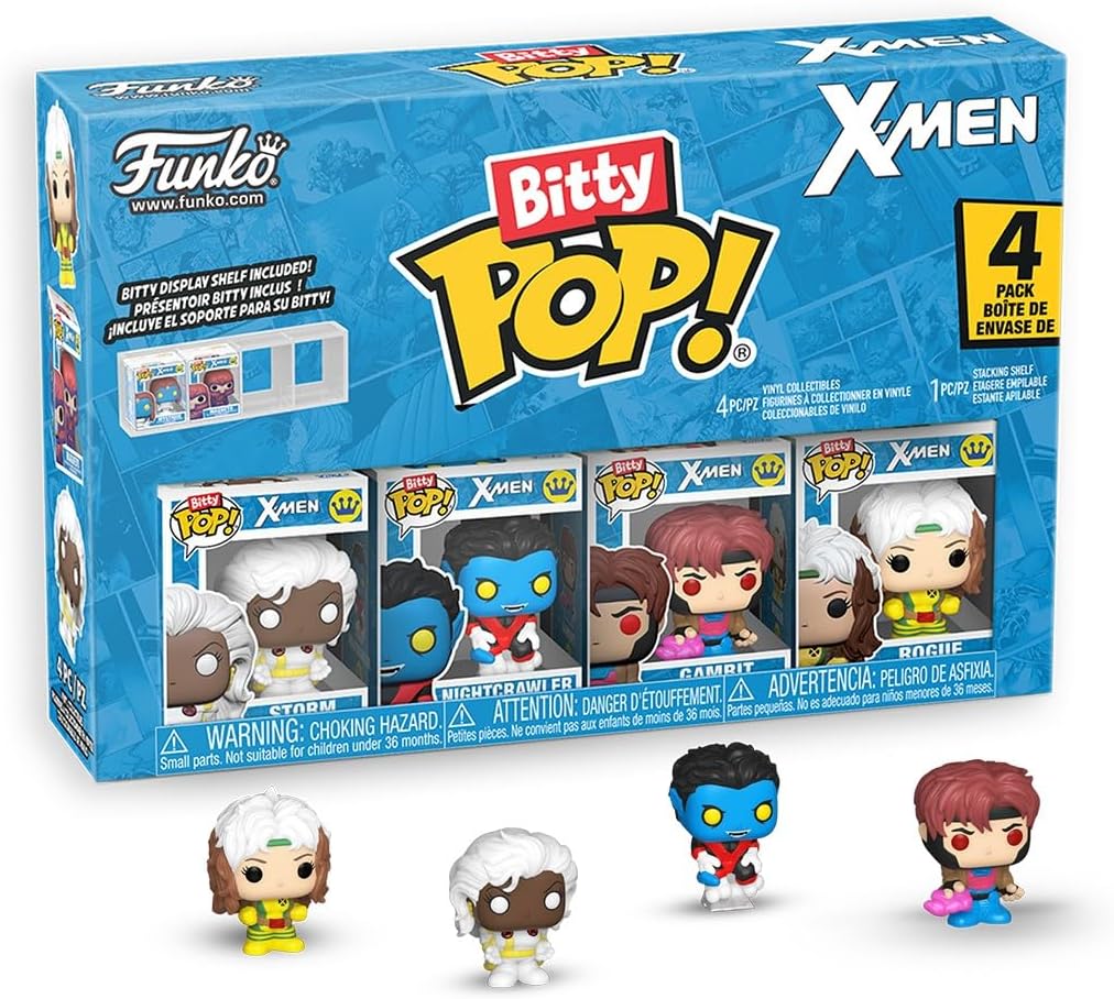 Lumea POP! devine tot mai mare — si mai mica — cu figurinele de colectie Bitty POP! Extinde-ti colectia Marvel X-Men cu acest pachet de 4 figurine care ii include pe Bitty POP! Rogue, Bitty POP! Nightcrawler, Bitty POP! Gambit si Bitty POP! Storm. Poti descoperi varianta chase Hyper Rare (1/6) Bitty POP! Beast!Figurinele Bitty POP! sunt ambalate in carcase rigide din acril, cu capace inferioare detasabile. Capacele detasabile pot fi folosite si ca baze din acril, pe care sunt fixate figurinele Bitty POP!. Sorteaza si aranjeaza-ti figurinele Bitty POP! cu ajutorul vitrinei de expunere incluse! Vitrinele din acril sunt suprapozabile si pot gazdui cate patru figurine Bitty POP! fiecare. Figurinele din vinil au o inaltime de aproximativ 2,3 cm. Un pachet contine patru figurine.