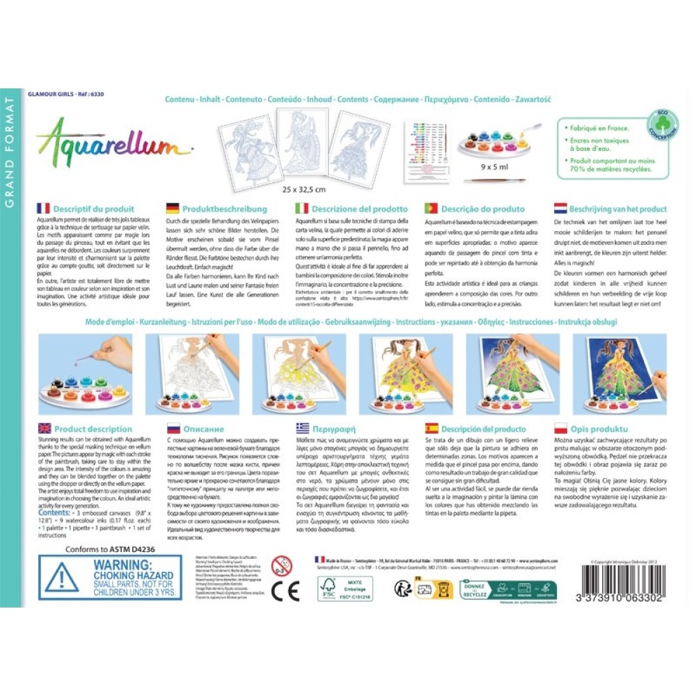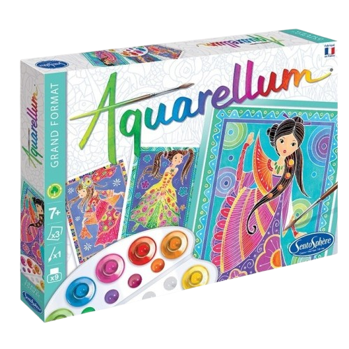 Setul creativ Aquarellum ajuta artistii de toate varstele sa descopere placerile picturii in acuarela prin tehnica sertisajului, invatand sa combine culorile si putand astfel sa creeze adevarate capodopere!In aceasta tehnica tablourile sunt predesenate cu ajutorul unui contur fin de ceara ecologica. Tehnica sertisajului implica doua mari avantaje:Conturul de ceara va impiedica amestecarea culorilor diferite care se pun in suprafetele vecine, deoarece culoarea nu adera pe el.La finalizarea picturii toate contururile raman albe si creeaza un contrast deosebit intre culorile vii din tablou.Ce contine setul creativ Aquarellum Glamour Girls:3 tablouri predesenate9 culori + 1 pipeta pentru dozaj1 pensula1 paletaAventura SentoSphere a inceput in 1989. Fondatoarea Veronique Debroise a fost intotdeauna convinsa ca un bun simt al mirosului este esential pentru dezvoltarea copilului. Acest lucru a determinat-o sa creeze Follow your Nose: un joc olfactiv bazat pe recunoasterea mirosului.In scurt timp, Veronique Debroise si-a dat seama de importanta celorlalte simturi umane. Prin urmare, ea a creat produse educationale axate pe simtul tactil, al gustului si vederii. Intrucat componenta senzoriala este strans legata de creativitatea artistica, Veronique Debroise a lansat colectiile Aquarellum, Sablimage, Patarev, Art & Creations si multe altele.Nu in ultimul rand, brandul frantuzesc SentoSphere foloseste ingrediente sigure si materiale ecologice.