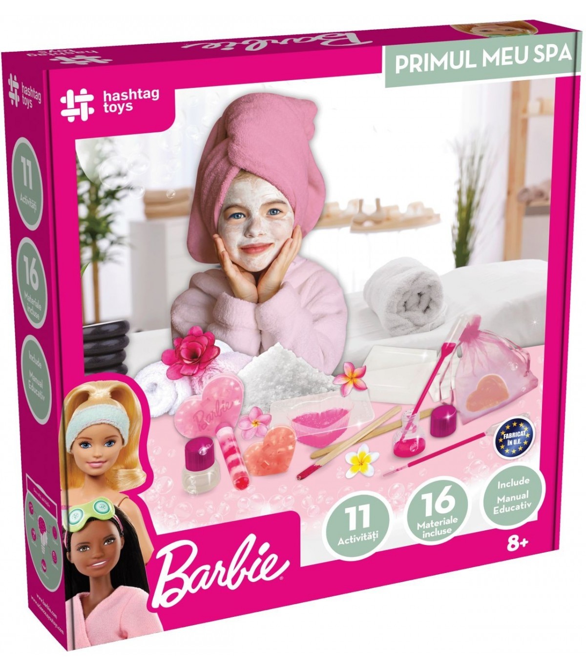 Set Barbie primul meu spa. Pregateste-te pentru o aventura captivanta in care creativitatea se intalneste cu ingrijirea personala! Experimenteaza o calatorie completa la spa cu acest set de activitati Barbie pentru fete, descoperind in acelasi timp secretele stiintifice care fac spa-urile atat de relaxante si benefice! Continutul kitului abtibilduri Barbie, sare de mare, baza de parfum tropical, baza de sapun, spatula de lemn, pipete Pasteur, colorant cosmetic roz, eprubete cu capac, manusi, matrita Barbie, punga de cadou.