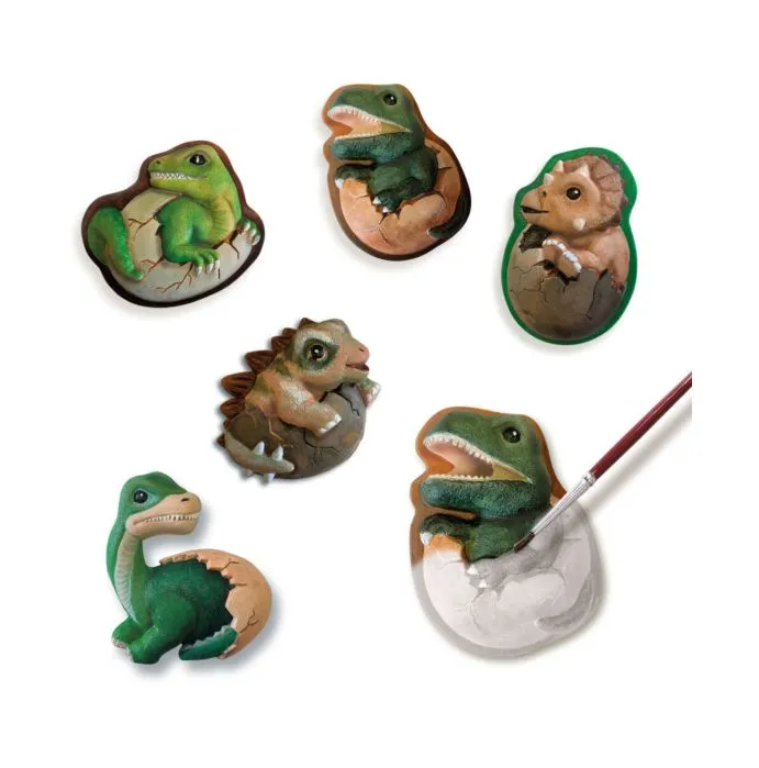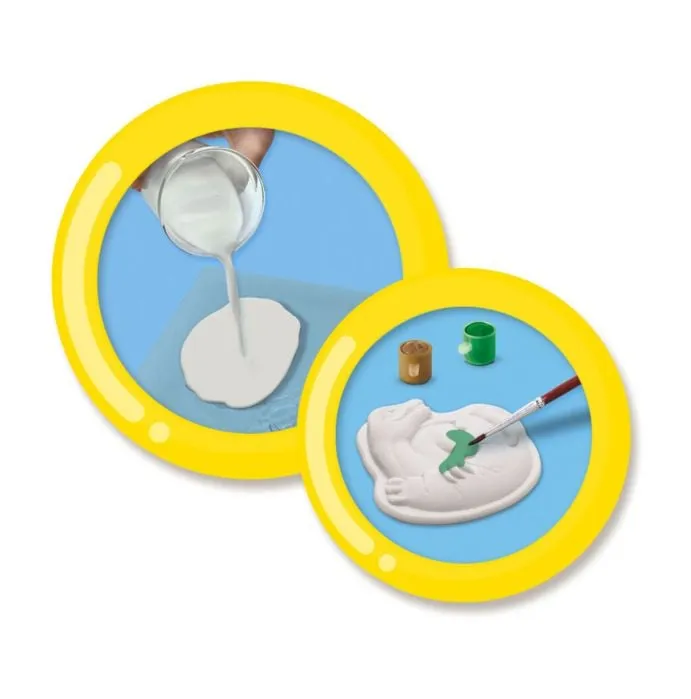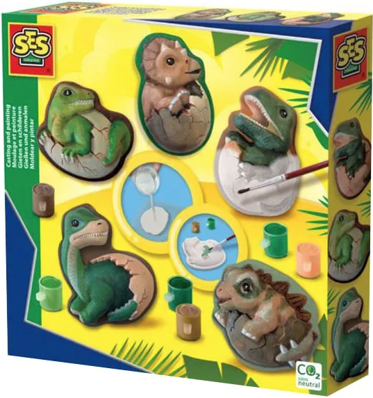 Acest set este special creat pentru toti fanii dinozaurilor! Poti realiza cu usurintadiferite figurine reprezentand dinozauri care tocmai ies din ou! La inceput amesteci pudra de modelare cu putina apa si torni amestecul in matrite.De indata ce ipsosul s-a intarit, poti incepe sa pictezi dinozaurul cu acuarelele incluse.Matritele detaliate ofera rezultate fantastice, iar ipsosul se usuca rapid. Vopseaua si ipsosul se spala usor de pe textile si de pe piele.SES prezinta o modalitate fantastica si neobisnuita prin care copiii pot deveni creativi. Cu acest kit distractiv si usor de utilizat, incepe prin a realiza formele de ipsos, turnand amestecul in matritele din plastic. Dupa ce s-au intarit si uscat, picteaza modelele asa cum iti place, folosind vopselele incluse. O modalitate excelenta de a dezvolta creativitatea, concentrarea si abilitatile motorii fine.SES este specialist in jucarii creative de mai bine de 40 de ani. Dezvoltarea copilului este conceptul central in dezvoltarea produselor acestui brand. Deoarece dezvoltarea este importanta in primii ani, este esential ca un copil sa aiba oportunitatea de a-si dezvolta talentele si de a-si folosi creativitatea. Pe langa stimularea creativitatii, siguranta si calitatea sunt cele mai importante aspecte ale tuturor produselor SES!Setul contine: matrita cu diverse modele de dinozauri300 g ipsosspatula6 acuarelepensulainstructiuni