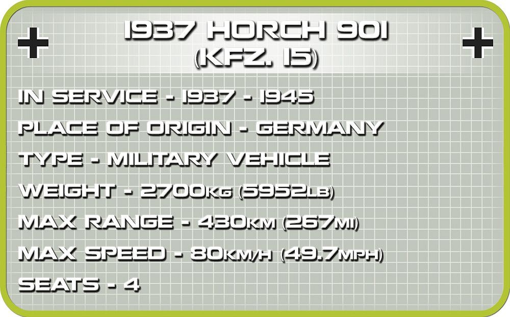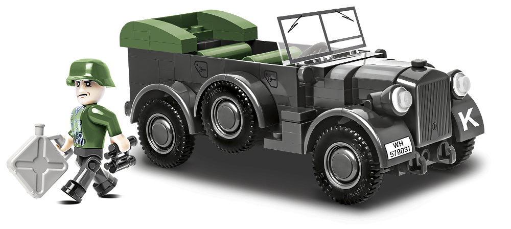 Horch 901 a fost o masina militara de teren folosita de fortele armate germane din 1937 pana in 1945. Produs cu miile, a devenit un mijloc de transport comun in armata. Initial masina a fost destinata transportului ofiterilor de stat major. De-a lungul timpului a inceput sa fie folosit pe post de camion medical pentru transportul ranitilor, masina de comunicatii, tractor de artilerie usoara si transportor de provizii pentru soldati.Din setul de 185 de blocuri de constructie COBI puteti construi vagonul militar de pasageri pentru terenuri Horch 901 (Kfz.15). Toate detaliile grafice sunt imprimeuri de inalta calitate, care nu se zgarie sau nu se zgarie, chiar si in timpul jocului intens. Designul este, de asemenea, remarcabil si, intr-un mod unic, reflecta formele originale ale inspiratiei sale istorice. Modelul surprinde cu noi tipuri de blocuri, care sunt excelente pentru constructia de masini si faciliteaza reluarea ulterioara si proiectarea propriilor creatii. O figura a unui sofer german echipat cu binoclu este inclusa cu vehiculul detaliat. Intregul set este completat de o placuta cu numele vehiculului.Masina personalului este accesoriul ideal pentru construirea de scene si diorame istorice care reproduc orice front european al celui de-al Doilea Razboi Mondial. Va fi un cadou grozav, indiferent de varsta destinatarului. De asemenea, va multumi colectionarilor adulti si pasionatilor de automobile si copiilor. Horsh 901 este un inceput excelent pentru a va incepe aventura cu blocurile de constructie poloneze COBI.Scara: 1:35Numar de figurine: 1Dimensiuni model: 13 x 5.5 x 5.5 cm