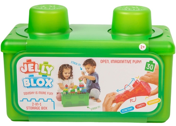 Set de constructie - Jelly BloxJelly Blox – singurele piese de construit care „incalca regulile”! Jelly Blox este un sistem de constructie inovator destinat copiilor mici si prescolarilor, care le permite sa stranga, intinda si preseze piesele dupa bunul plac! Conceput pentru a sprijini etapele-cheie ale dezvoltarii prin joaca tactila si senzoriala. Unele piese sunt umplute cu materiale senzoriale speciale – cum ar fi nisip, bilute din spuma, mini-stelute si mini-caramizi – pentru un plus de textura si amuzament! Aceste piese moi si flexibile elimina grija de a calca din greseala pe ele, iar curatarea lor este simpla – doar cu apa si sapun delicat! Cutia de depozitare 2-in-1 include 30 de piese colorate si are un capac cu placa de constructie integrate. Cand joaca s-a incheiat, puneti pur si simplu piesele inapoi in cutie si inchideti capacul. Daca aveti mai multe cutii, le puteti depozita cu usurinta una peste alta.