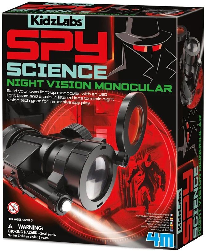 Experimenteaza lumea noptii intr-o lumina complet noua cu monoclul de la 4M Science Kit. Construieste-ti propriul monoclu cu vedere nocturna, cu fascicul de lumina LED si lentila cu filtru colorat, pentru a imita echipamentul tehnologic de vedere nocturna, pentru o experienta de spionaj realista. Cu o lentila reglabila pentru claritate optima si aventura. Ajusteaza focalizarea rotind butonul pentru a schimba pozitia lentilei mari. Roteste suportul de film pentru a schimba perspectiva intre vederea normala si filtrul rosu.