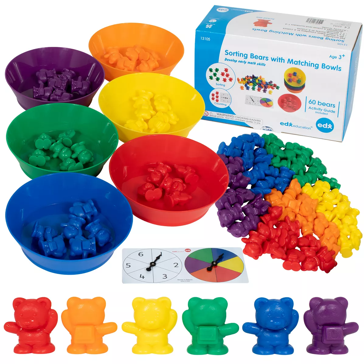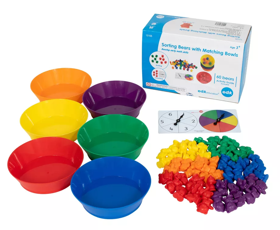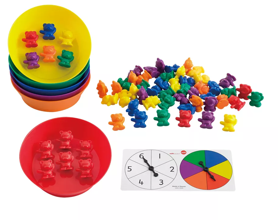 Set de numarat si de sortat cu boluri asortate, Ursi coloratiSetul contine 60 piese de sortat, 6 boluri, 1 ruleta numerotat si o brosura de activitati. Contine piese din plastic non-toxic variat colorate care fac apel la simtul senzorial si care pot contribui la dezvoltarea limbajului si competentelor matematice de baza, ca adunarea si inmultirea. Permite utilizarea in multiple posibilitati combinatorii: sortat, numarat, recunoasterea culorilor, recunoasterea secventelor si pot fi folosite cu succes si in activitati cu copiii cu nevoi speciale. Produs cu activitati destinate varstei 3+.Produsul poate contine piese mici care se pot inghiti sau inhala, existand pericol de sufocare. Produs nerecomandat copiilor sub 3 ani. Va rugam sa supravegheati copilul in timpul folosirii acestui produs!