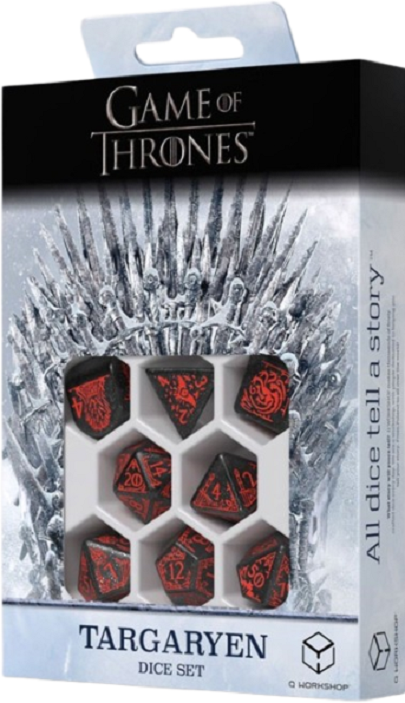 Acest set de zaruri licentiat oficial intruchipeaza mostenirea extravaganta a Casei Targaryen, cu zaruri negre stralucitoare si gravuri rosii vibrante care reflecta culorile acestora. Designul prezinta aripi de dragon si flacari, insotite de sigiliul si motto-ul casei, afirmand fara echivoc mostenirea lor ancestrala. Fiecare detaliu este atent realizat pentru a evoca recunoasterea, facand din acest set un must-have pentru fanii Game of Thrones.Caracteristici:Un set de zaruri si prestigiu – Acest set contine 8 piese: D6, D8, D10, D00, D12, D20 si doua versiuni ale D4 (clasica si moderna).Culorile Westeros – Materialul negru stralucitor al zarurilor (infuzat cu pudra de sclipici) este impodobit cu gravuri rosii, asigurand o lizibilitate perfecta si o imersiune totala.Simboluri Targaryen – Fetele cu cea mai mare valoare ale fiecarui zar prezinta embleme iconice: sabia, sigiliul dragonului cu trei capete, o coroana regala, motto-ul casei, focul si aripi de dragon.O comoara versatila – Fabricate cu grija din materiale premium, aceste zaruri sunt perfecte pentru sesiuni de jocuri de rol, jocuri de societate sau ca obiecte de colectie pentru fanii Game of Thrones.