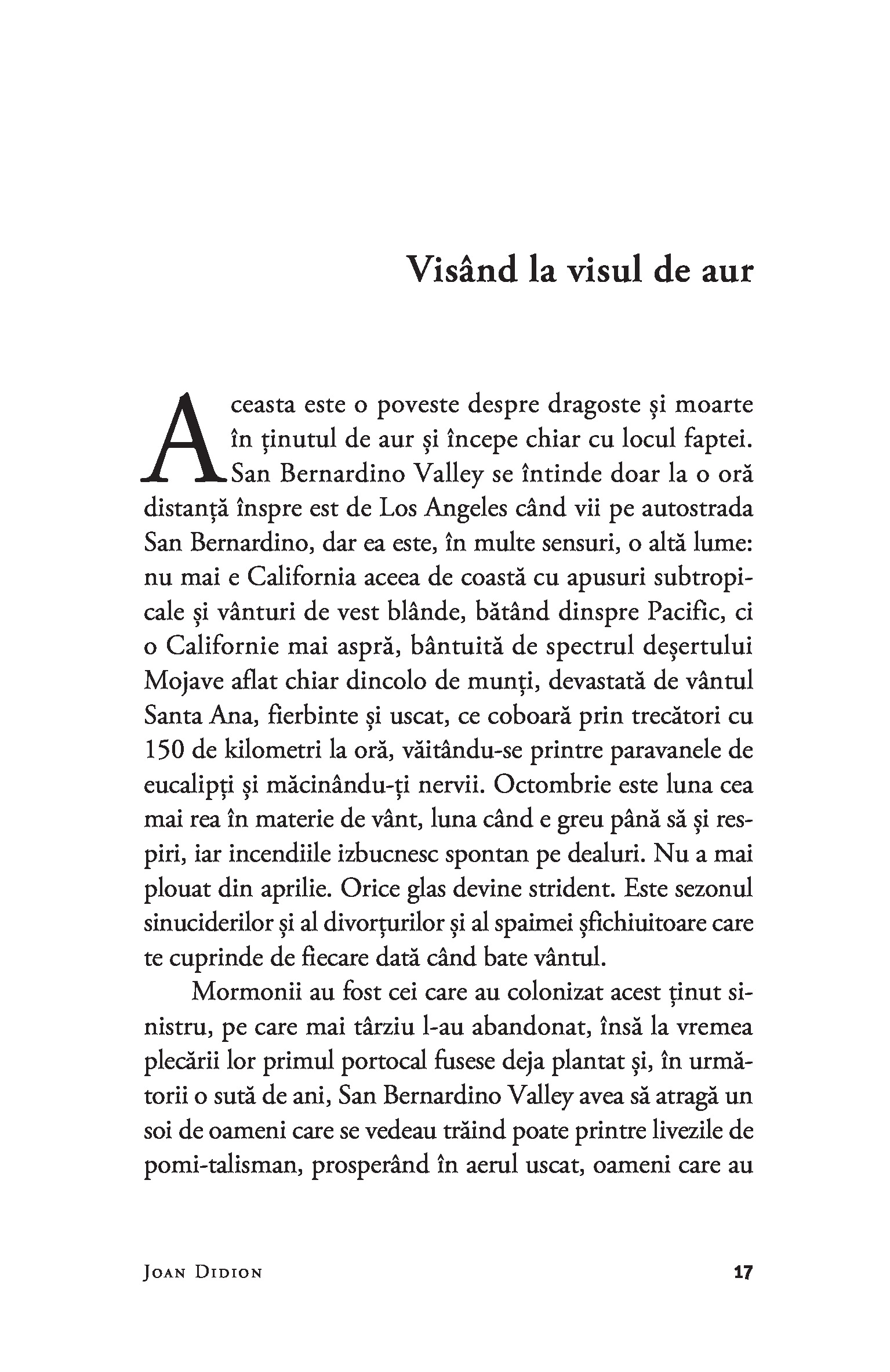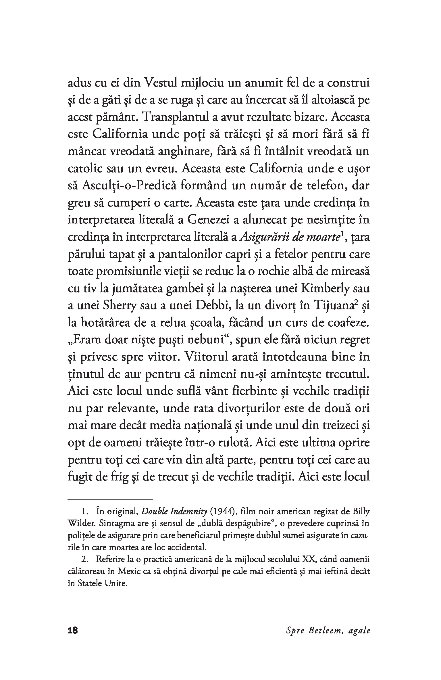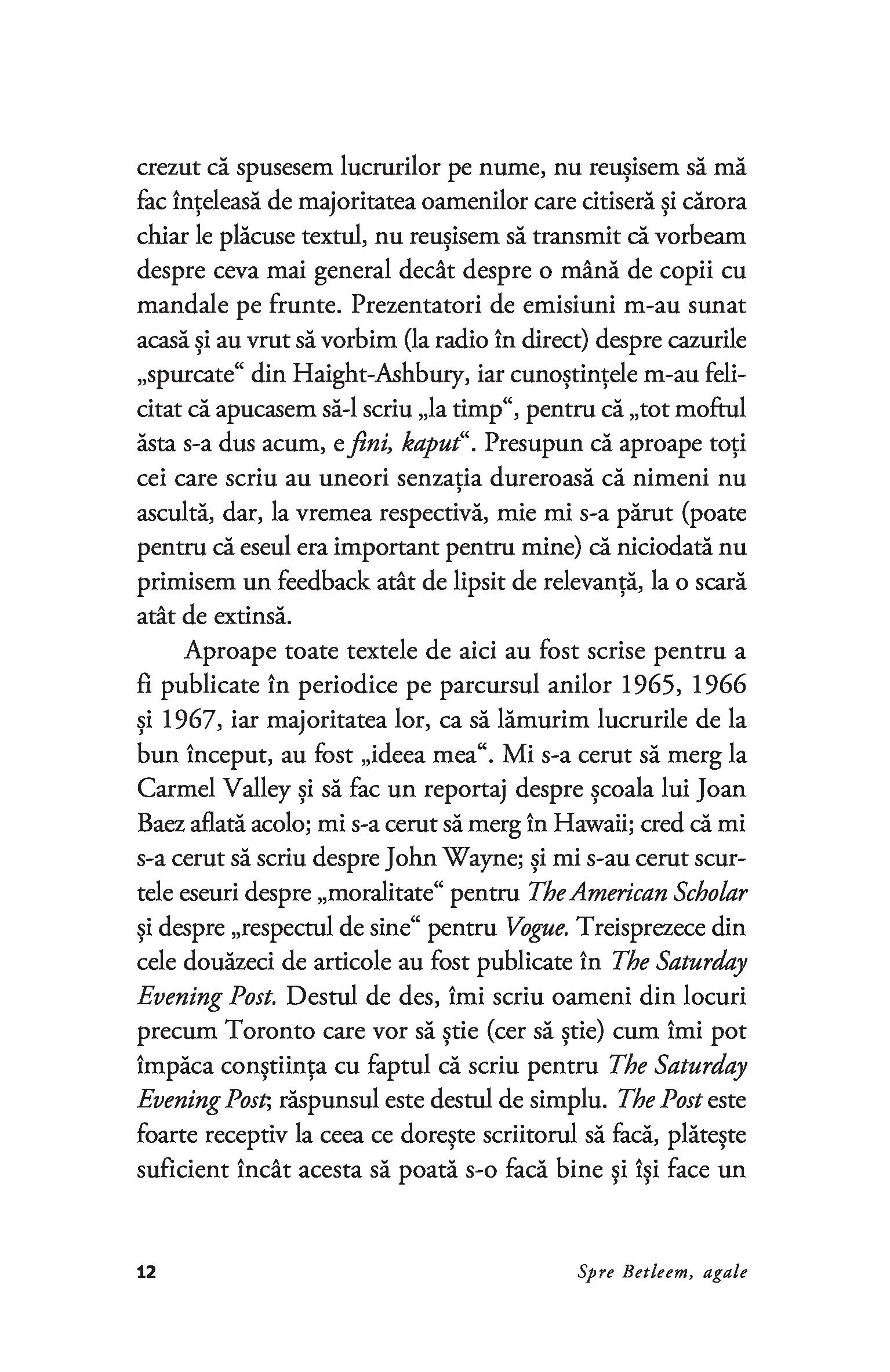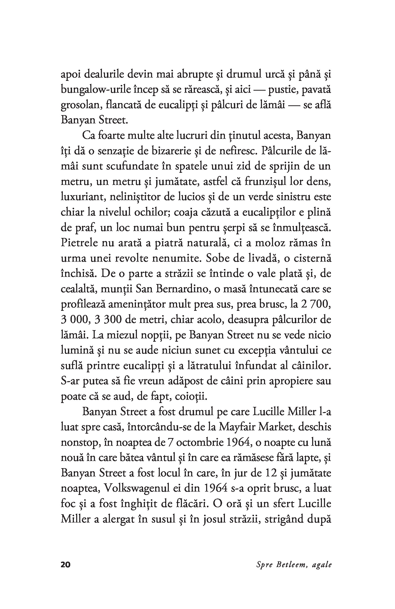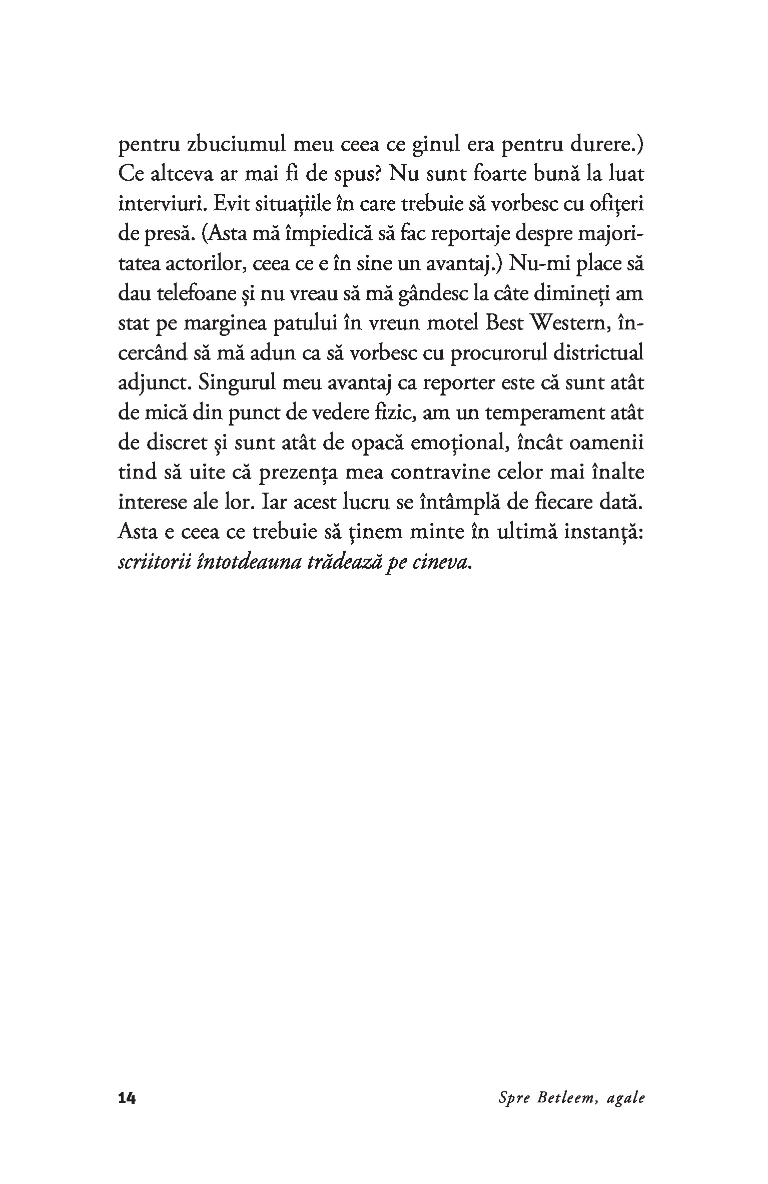 „Scriitorii tradeaza intotdeauna pe cineva.” – Joan DidionDesi primul volum de nonfictiune publicat de Joan Didion, Spre Betleem, agale este alcatuit din eseuri si reportaje care au devenit in scurt timp repere stilistice in proza americana a secolului XX. Dupa cum s-a spus, Joan Didion priveste lumea contemporana cu detasare rece, de parca ar fi un observator de pe alta planeta, ochiul ei surprinzand insa detalii si implicatii ale evenimentelor care le scapa in general „analistilor“de meserie. De la o crima pasionala in peisajul sublunar californian si pana la San Franciscoul hippy al anilor 1960, mintea lui Joan Didion proceseaza mai curand fluxul subteran al istoriei contemporane, redandu-l apoi prin filtrul personalitatii ei care-si pune amprenta asupra universului contemplat. Impreuna cu volumul The White Album, Spre Betleem, agale poate fi considerat o lectie despre eleganta gandirii, stil si luciditate.„Didion a fost martora elocventa a celor mai insolubile si incapatanate adevaruri ale vremurilor noastre.“ – Joyce Carol Oates„Ne infatiseaza actori si milionari, sotii blestemate si consumatori naivi de acid, ideologi de stanga si snobi din aristocratia hawaiiana intr-un fel care nu-i face sa para malefici ori fascinanti, ci plini de viata, imperfecti si adesea frumosi.“ - The New York Times Book ReviewJoan Didion (1934–2021) este autoarea a cinci romane si a paisprezece carti de nonfictiune, printre care South and West si Where I Was From. Volumul ce reuneste toate operele sale de nonfictiune, We Tell Ourselves Stories in Order to Live, a fost publicat de Everyman’s Library in 2006. In colectia Anansi. Ego au mai aparut volumele Anul gandirii magice (recompensat cu National Book Award for Nonfiction), Nopti albastre si Uite cum sta treaba.