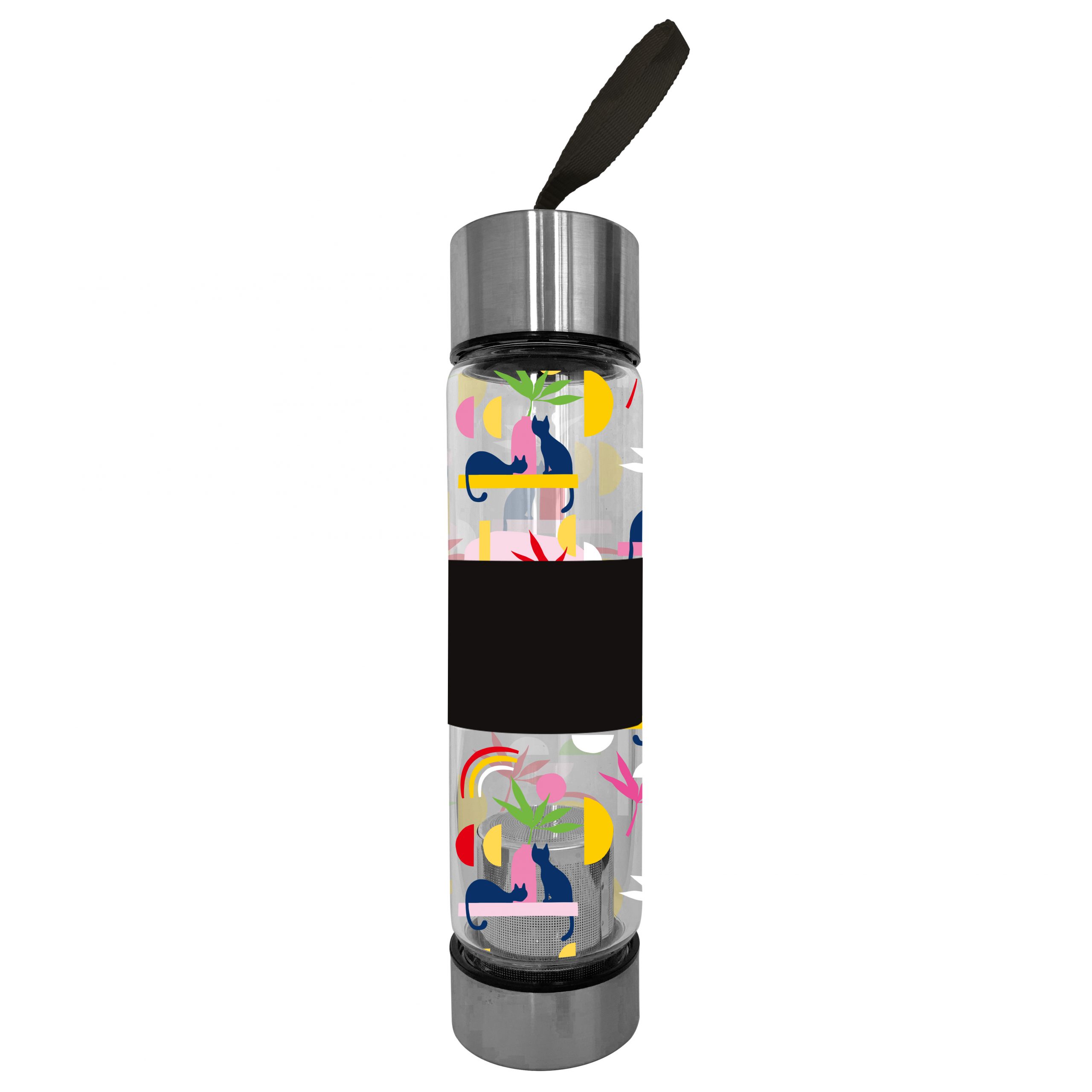 Sticla cu infuzor decorata cu pisici si prevazuta cu maner textil pentru prindere si transport.Din 2006, KIUB a publicat si distribuit concepte inovatoare de papetarie si cadouri.Promisiunea marcii are la baza suport personalizat si articole de inalta calitate.