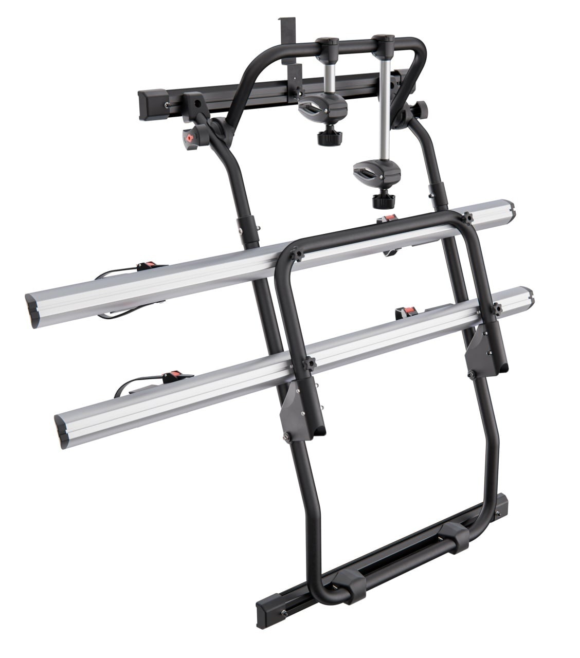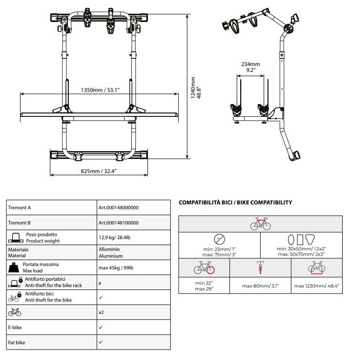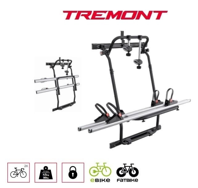 Suport pentru biciclete cu prindere pe usa din spate a autorulotei sau a dubei Menabo Tremont A pentru Ram Pro Master, model 2013+, H1, H2, H3 Menabo Tremont A este suportul de bicicleta ideal pentru autoturismele tip furgon. Suportul Tremont se monteaza pe haionul autoturismului. Bicicletele trebuie asezate si fixate cu rotile pe sinele suportului si se securizeaza cu ajutorul priderilor pe baza de clema cu blocaj care inconjoara rotile. Suportul Menabo Tremont A are integrate si brate cu prinderi speciale care se amplaseaza pe cadrul bicicletelor conform instructiunilor de montaj. Capacitatea maxima de transportul a suportului Tremont A este de 45 de kg. Suportul de bicicleta Tremont A este compatibil cu o gama larga de biciclete precum: mountain bikes, cursiere, city bikes, fat bikes si E-bikes. Sistemul antifurt pentru biciclete este actionat cu ajutorul cheii primite in pachetul de produs. Menabo Tremont A este fabricat din aluminiu special tratat pentru rezistenta sporita. Foloseste Menabo Tremont A si pleaca la drum cu 2 biciclete, oriunde si oricand! Specificatii tehnice Menabo Tremont A cu prindere pe camper Marca Ram Model Pro Master model 2013+ H1 H2 H3 Numar biciclete 2 Compatibil Fat Bike Da Compatibil eBike Da Material Aluminiu Nr. prinderi de caroserie 2 Cleme pentru prindere bicicleta Da Bicicletele se ating intre ele Nu Greutate maxima suportata 45 kg Antifurt suport Nu Antifurt bicicleta Da Pliabil Da Diametru cadru Toate Mod prindere bicicleta Cadru, Roti Dimensiuni ambalaj Greutate produs 12.9 Kg