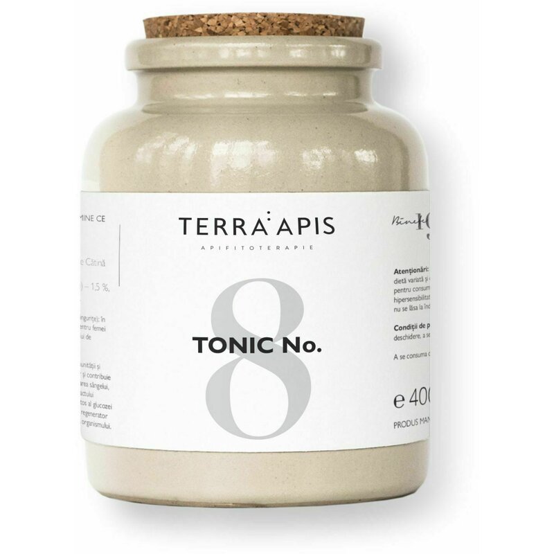 TONIC NO. 8, natural, 400g, Terra Apis Sustine sistemul imunitar — Sporeste capacitatile mentale si fizice — Copii < 30 kg PEDIATRIE • preventie si tratament ELEVI • surmenaj intelectual SPORTIVI • epuizare fizica / sustinerea efortului DESCRIERE Ingrediente: miere de albine, polen crud – 12,7 %, fructe de Catina (Hippophae rhamnoides) – 5,3 %, Scortisoara (Cinnamonum zeylanicum) – 1,7 %, fructe de Armurariu (Silybum marianum) – 1,5 %, laptisor de matca crud – 1,2 % si propolis integral – 1,2 %. Mod de utilizare: intern; in regim obisnuit de viata: intre 5 si 15 g/zi (1-3 lingurite); in regim de suprasolicitare fizica sau psihica: intre 15 si 30 g/zi (3-6 lingurite); pentru femei insarcinate, copii si persoane cu probleme de sanatate: cu avizul consultantului de specialitate. A se amesteca inainte de consum. Proprietati: Polen – ajuta la sporirea vitalitatii/energiei, la imbunatatirea imunitatii si sustine sanatatea vaselor sanguine; Catina – intareste sistemul cardiovascular si contribuie la apararea naturala a organismului; Scortisoara – efect tonic, ajuta la purificarea sangelui, la mentinerea nivelurilor normale ale lipidelor sanguine, sustine sanatatea tractului respirator superior si productia de colesterol bun, contribuie la nivelul sanatos al glucozei si la sporirea capacitatilor mentale si fizice; Armurariu – hepatoprotector si regenerator hepatic, ajuta la pastrarea sanatatii inimii, promoveaza digestia si purificarea organismului. Contribuie la intarirea organsimului. Are proprietati stimulente ce contribuie la sporirea capacitatilor mentale si fizice in situatii de oboseala (extenuare). Invigoreaza organismul / ajuta la regasirea de mai multa energie / sustine starea energetica. Efect tonic. Sustine sanatatea tractului respirator superior. Ajuta la mentinerea confortului la nivel de organism, cap si dinti. Pentru prematuri sau nou-nascuti cu deficiente nutritionale: imbunatatirea starii generale, cresterea in greutate, a poftei de mancare, a concentratiei de celule sanguine rosii si de hemoglobina. Poate ajuta la mentinerea nivelurilor sanatoase ale zaharului sanguine si greutate sanatoasa / diabet. Sanatatea intestinala / diaree / constipatie. Piele si membrane mucoase / sustine sanatatea pielii si a cavitatii bucale. Cardiovascular / sustine inima si circulatia. Ajuta la purificarea sangelui. Ajuta la mentinerea nivelurilor normale ale lipidelor sanguine. Sustine productia de colesterol bun (HDL – lipoproteine de densitate mare). Metabolismul glucozei / ajuta la mentinerea unui nivel sanatos al glucozei sanguine / ajuta la mentinerea nivelului normal al glucozei ca parte a unui stil de viata sanatos. Atentionari: Acest produs este un supliment alimentar si nu trebuie sa inlocuiasca o dieta variata si echilibrata si un stil de viata sanatos. A nu se depasi doza recomandata pentru consumul zilnic. Contraindicat persoanelor cu intoleranta la fructoza, in caz de hipersensibilitate la produsele apicole sau la oricare dintre ingredientele din compozitie. A nu se lasa la indemana si la vederea copiilor mici. Conditii de pastrare: Intre 18 si 25 ºC, in flaconul original, bine inchis. Dupa deschidere, a se pastra in frigider si a se consuma in maximum 30 de zile. Informatii suplimentare: Masa nominala 400 gr Masa bruta 815 gr Valoare energetica 1341 kJ/100 gr, 316 kcal/ 100gr Mode de prezentare Flacon ceramic cu dop de pluta Dim. flacon (Ø x h): 85 x 120 mm