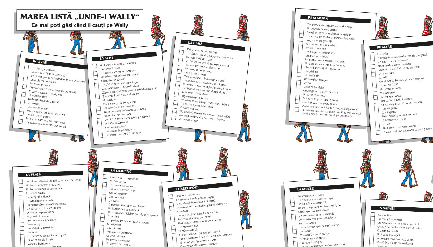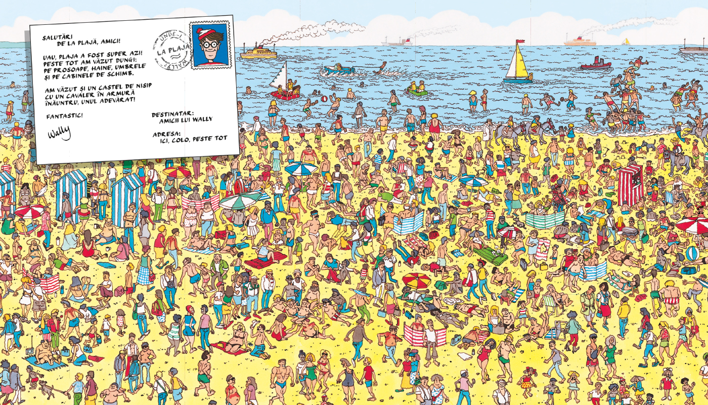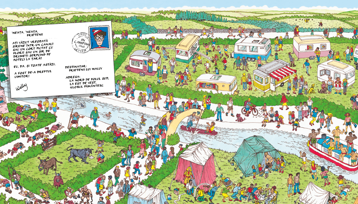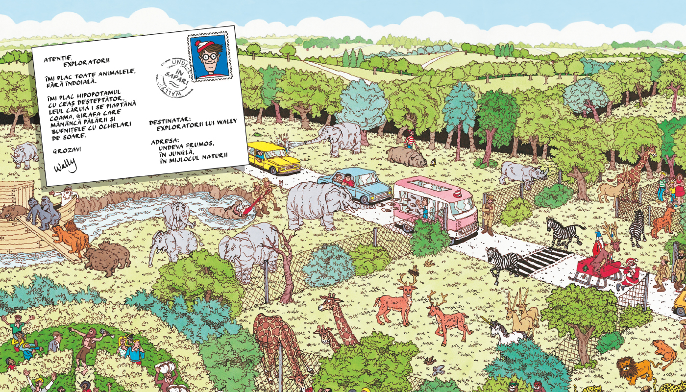 Salutare, prieteni! Numele meu este Wally. Sunt gata sa pornesc intr-o calatorie in jurul lumii. Puteti veni si voi! Trebuie doar sa ma gasiti.Am cu mine tot ce imi trebuie – baston de drumetie, ceainic, ciocan pentru batut cuie de cort, cana, rucsac, sac de dormit, binoclu, aparat de fotografiat, tub pentru snorkeling, curea, geanta si lopata.Nu calatoresc singur. Oriunde as fi, in jurul meu sunt multe alte personaje pe care te invit sa le descoperi. Mai intai, gaseste-i pe Ham (nu-i poti vedea decat coada), pe Wenda, pe vrajitorul alb si pe Odlaw. Apoi cauta-i pe cei 25 de fani Wally – fiecare apare o singura data in calatoria mea.Exista si un personaj care apare in fiecare scena, poti sa-l gasesti? In plus, tot in fiecare scena, poti gasi cheia mea, osul lui Ham, aparatul de fotografiat al Wendei, pergamentul vrajitorului alb si binoclul lui Odlaw. Le vezi?