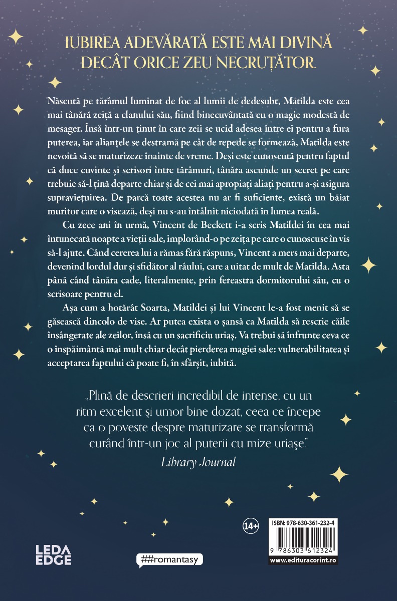 #html-body [data-pb-style=SFSPKI9]{justify-content:flex-start;display:flex;flex-direction:column;background-position:left top;background-size:cover;background-repeat:no-repeat;background-attachment:scroll}Iubirea adevărată este mai divină decât orice zeu necruțător. Născută pe tărâmul luminat de foc al lumii de dedesubt, Matilda este cea mai tânără zeiţă a clanului său, fiind binecuvântată cu o magie modestă de mesager. Însă într-un ţinut în care zeii se ucid adesea între ei pentru a fura puterea, iar alianţele se destramă pe cât de repede se formează, Matilda este nevoită să se maturizeze înainte de vreme. Deși este cunoscută pentru faptul că duce cuvinte și scrisori între tărâmuri, tânăra tăinuiește un secret pe care trebuie să-l ţină departe chiar și de cei mai apropiaţi aliaţi, pentru a-și asigura supravieţuirea. De parcă toate acestea nu ar fi suficiente, există un băiat muritor care o visează, deși nu s-au întâlnit niciodată în lumea trează. Cu zece ani în urmă, Vincent de Beckett i-a scris Matildei în cea mai întunecată noapte a vieţii sale, implorând-o pe zeiţa pe care o cunoscuse în vis să-l ajute. Când cererea lui a rămas fără răspuns, Vincent a mers mai departe, devenind lordul dur și sfidător al râului, care a uitat de mult de Matilda. Asta până când tânăra cade, literalmente, prin fereastra dormitorului său, cu o scrisoare pentru el. Așa cum a hotărât Soarta, Matildei și lui Vincent le-a fost menit să se găsească dincolo de vise. Ar putea exista o șansă ca Matilda să rescrie căile însângerate ale zeilor, însă cu un sacrificiu uriaș. Va trebui să înfrunte ceva ce o înspăimântă mai mult chiar decât pierderea magiei sale: vulnerabilitatea și acceptarea faptului că poate fi, în sfârșit, iubită. „Plină de descrieri incredibil de intense, cu un ritm excelent Şi umor bine dozat, ceea ce începe ca o poveste despre maturizare se transformă curând într-un joc al puterii cu mize uriașe.” Library Journal „Lumea zeilor – relațiile, istoriile și jocurile lor politice – este fascinantă, iar drumul Matildei spre autocunoaștere, precum și disperarea ei de a-i proteja pe cei pe care îi iubește, oferă un material extrem de captivant.” Booklist „Un roman fantasy tulburător de frumos pe care nu trebuie să îl ratezi […]. O tânără zeiță cu stele și puteri ascunse și al treilea fiu muritor al unui Lord. Mi-au cucerit inima. Sper să o cucerească și pe a ta.” Books Are My Third Place „Am terminat cartea și pur și simplu am izbucnit în plâns, holbându-mă la un perete gol. Povestea asta m-a tulburat în cel mai bun mod posibil, așa cum doar o carte extraordinară o poate face.” Bookish Goblin