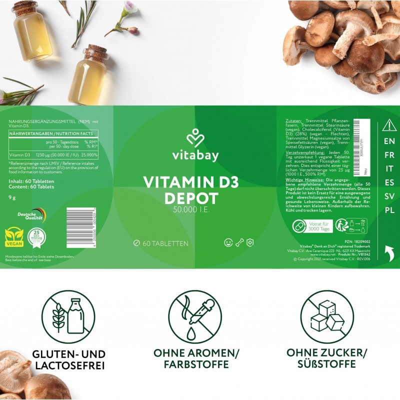 Vitamina D3 beneficii: • Vitamina D3 este cruciala pentru sanatatea oaselor • Vitamina D3 reduce rahitismul si osteomalacia • Vitamina D3 amelioreaza osteoporoza si fracturile • Vitamina D3 poate îmbunatati performantele fizice • Vitamina D3 îmbunatateste functiile cognitive • Vitamina D3 este benefica pentru dezvoltarea si functionarea creierului • Vitamina D3 reduce depresia • Vitamina D3 este benefica în scleroza multipla • Vitamina D3 îmbunatateste calitatea somnului • Vitamina D3 reduce riscul bolilor cardiovasculare Vitamina D, cunoscuta si sub numele de vitamina soarelui, este o vitamina esentiala în liposolubile. Se poate obtine fie prin alimentele din dieta, fie prin alimente si suplimente alimentare, fie sintetizat în piele la expunerea la lumina soarelui. Vitamina D3 este în mod obisnuit, obtinuta din dieta sau produsa de piele de la energia ultravioleta a soarelui. Cu toate acestea Vitamina D3 nu este abundenta în produsele alimentare, insa se poate obtine Vitamina D3 natural la pret accesibil pentru persoanele care au nevoie de aceata vitamina. Pe masura ce mai multi oameni evita expunerea la soare, suplimentarea cu Vitamina D-3 devine si mai necesara pentru a va asigura ca organismul dumneavoastra primeste o cantitate adecvata. Desi este clasificata ca o vitamina, trebuie considerata prohormona deoarece este implicata în numeroase procese metabolice din organism. Vitamina D 3 joaca un rol important în balanta calciului si a fosforului, importanta în sanatatea oaselor si activitatea nervoasa si musculara. De asemenea, regleaza tensiunea arteriala, functia imuna, productia celulara si secretia de insulina. Vitamina D beneficii dovedite stiintific Este important de observat ca multe dintre studiile privind vitamina D sunt studii de asociere, ceea ce înseamna ca deficienta este corelata cu o anumita problema, dar nu provoaca neaparat aceasta problema. Cu toate acestea, în multe dintre aceste cazuri, motivul pentru care sanatatea oamenilor este mai rau este ca ei nu primesc suficiente soare decât sa fie deficitare în vitamina D. Soarele are multe beneficii pentru sanatate care sunt independente de vitamina D. Atât de scazut poate fi vitamina D adesea mai mult ca un semnal ca cineva nu primeste suficienta soare, care este cauza reala a problemei de sanatate. Vitamina D Vegană naturală din Licheni cu 50.000 UI pe comprimat Vitamina D3 este printre cele mai bune și cele mai cunoscute substanțe nutritive cercetate. Importanța sa pentru sănătatea organismului nostru, începând cu sistemul imunitar, asupra funcției osoase și musculare până la starea de sanatate a inimii noastre, a fost dovedit în detaliu în toate studiile. De peste zece ani, aceasta vitamina atrage de asemenea atenția: După ani amănunțiti și lungi de cercetare, putem oferi clienților noștri o doză mare și astăzi v. a. Furnizați vitamina biodisponibilă și total-vegană de Vitamina D3: Într-un singur comprimat, 50.000 UI din această vitamină sănătoasă sunt grupate. Vitamina D3 de 50000 UI are un efect pronunțat de depunere. Vitamina D3 este una dintre vitaminele solubile în grăsimi și poate fi astfel stocată în țesutul gras. Avantajul de vitamine foarte concentrat comprimate noastre D3 este că va fi furnizat după ingestie sa pentru o lungă perioadă de timp cu aceasta vitamina esentiala - chiar si in lipsit de soare. Vitamina D3 este supusa procedurilor de control ridicate, în conformitate cu standardul ISO 13485, oferind astfel clienților noștri cu un certificat și asigura producția controlată. Astfel, toate procesele de fabricație - de la primirea prin producție la livrarea către client - sunt observate, înregistrate și verificate în detaliu. Esența sursei noastre de vitamina D3 este biodisponibilitatea ridicată, care ne permite să producem o vitamină D3 care este eficientă pentru nevoile dumneavoastră. În plus, vitamina D3 din sursa vegetală 100% (licheni) este tratată într-un proces natural, biochimic. Prospect Vitamina D3 Mod administrare: La fiecare 50 de zile, înghițiți 1 comprimat întreg VEGAN cu multă apă sau suc. Aceasta corespunde unui consum zilnic de 25 μg (1000 IU, 500% DZR). Compozitie: 1 tableta contine 50.000 UI de Vitamina D3 (Colecalciferol), 10.000% DZR. Portii: 60 portii. Acest produs nu este un medicament. Informații nutriționale Doza zilnica Procentul cantității de referință în conformitate cu LMIV * Vitamin D3 1250 mcg (50.000 IE / IU) 25.000% * Regulamentul informații din domeniul alimentar Ingrediente: Cholecalciferol (vitamina D3) (28%) (vegană - licheni), agent de eliberare fibre vegetale (vegan), agent de eliberare cornflour (vegan), agent de eliberare dextrin (vegan), agent de eliberare săruri de magneziu ale acizilor grași (vegan) . ATENTIE: Nu luati acest produs daca sunteti insarcinata sau alaptati. A nu se lasa la indemana copiilor. Nu utilizati daca sigiliul este rupt. A se pastra intr-un loc racoros si uscat. Nu folositi un supliment alimentar ca inlocuitor al unei alimentatii variate si echilibrate! Acest supliment alimentar nu este destinat sa diagnosticheze, sa trateze, sa vindece sau sa previna vreo boala.