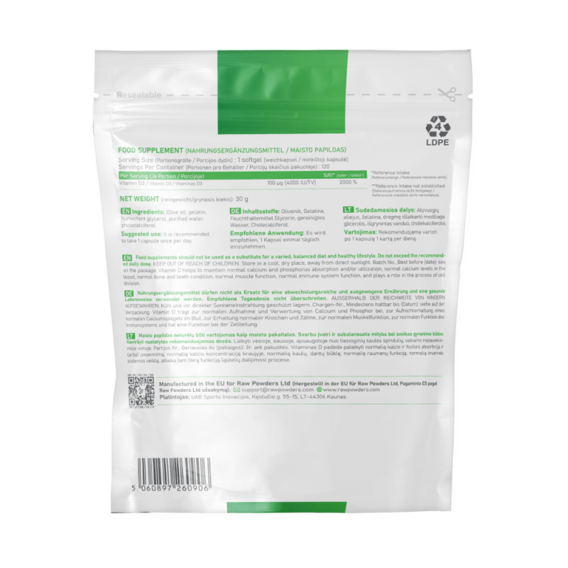 Vitamin D3 4000IU 120 Capsule moi, Raw Powders Beneficii cheie Supliment alimentar de înaltă calitate Îmbunătățește sistemul imunitar Poate regla starea de spirit și reduce depresia Raw Powders™ oferă vitamina D3! CE ESTE VITAMINA D3? O vitamină D3 liposolubilă ajută la absorbția calciului și fosforului în organism. Pentru dezvoltarea și menținerea oaselor și a altor țesuturi sănătoase, este esențial să se consume cantitățile recomandate de vitamina D. Conform studiilor, vitamina D3 (colecalciferol) crește nivelul de vitamina D din sânge mai eficient decât vitamina D2. DE CE VITAMINA D3? Pentru cei care au deficit de vitamina D, capsulele de vitamina D3 de 4000 UI sunt cea mai bună alegere pentru a reduce deficiența. Corpul nostru are nevoie ca nivelurile de vitamine să fie la locul lor pentru a funcționa corect. 1. Vitamina D contribuie la absorbția/utilizarea normală a calciului și fosforului. 2. Vitamina D contribuie la niveluri normale de calciu din sânge. 3. Vitamina D contribuie la menținerea oaselor normale. 4. Vitamina D contribuie la menținerea funcției musculare normale. 5. Vitamina D contribuie la menținerea dinților normali. 6. Vitamina D contribuie la funcționarea normală a sistemului imunitar. 7. Vitamina D are un rol în procesul de diviziune celulară. Prospect Vitamin D3 Mod administrare: Ca supliment alimentar, luați 1 capsulă pe zi cu alimente. Acest produs este destinat utilizării alături de un stil de viață activ și o dietă echilibrată. AVERTISMENT: Consultați medicul înainte de a începe să utilizați orice supliment dacă sunteți gravidă sau luați alte medicamente sau aveți probleme de sănătate. În caz de modificări fizice sau mentale nedorite, discutați utilizarea și dozajul cu un profesionist. Orice suplimentare este interzisă persoanelor sub 18 ani. Ulei de măsline virgin, gelatină (os bovin), glicerină, apă purificată, vitamina D3 (1 milion UI/G) (conține: vitamina D3 4000 UI). „Alte ingrediente” în capsule și tablete. Prin sintagma „alte ingrediente” ne referim la acele componente care nu fac parte din substanța principală. Cu toate acestea, acestea sunt totuși necesare pentru forme suplimentare precum capsule și tablete. Lianții, excipienții și substanțele de umplutură sunt necesare pentru tipurile de suplimente menționate anterior - sunt agenți de încărcare care mențin întregul conținut laolaltă, asigurând un consum și o absorbție mai bune. În plus, există două tipuri diferite de excipienți, lianți și materiale de umplutură - sintetici și naturali. Misiunea Raw Powders pentru astăzi este de a elimina cât mai multe ingrediente sintetice posibil și de a face suplimentul „mai curat”. Prin urmare, continuăm să ne îmbunătățim formulele și să căutăm cele mai bune componente. Așadar, deocamdată, vom reprezenta toți lianții și materialele de umplutură pe care le folosim în suplimentele Raw Powders: Stearat de magneziu: reglează aderența și fluiditatea. De exemplu, dacă substanța principală nu este suficient de pudră, nu va umple capsula din cauza aderenței sale. La fel și cu substanța prea pudră. Stearatul de magneziu este fabricat din magneziu și acid stearic, derivat din ulei vegetal. Toate suplimentele Raw Powders conțin o cantitate foarte mică de stearat de magneziu (3-8 mg). Stearatul de magneziu este potrivit pentru vegetarieni și vegani. Celuloză microcristalină: este o umplutură pe care o înlocuim în prezent cu făină de orez. Sistemul nostru digestiv nu poate absorbi celuloza microcristalină (trece neabsorbită). Materialele de umplutură asigură că capsula și tableta sunt umplute în proporțiile corecte - umplu cavitățile care rămân goale. Făină de orez: un material de umplutură care poate fi absorbit în tractul gastrointestinal. Făina de orez este un material de umplutură natural, fără gluten. Hipromeloză: este capsula în sine (acoperă conținutul din interior). Hipromeloza este o formă de celuloză care poate fi consumată de vegetarieni și vegani. Dimensiunile standard ale unei capsule sunt de 0,68 ml (250 - 400 mg) sau 0,95 ml (350 mg - 700 mg). Prin urmare, cel mai mic conținut al unei substanțe suplimentare principale ar trebui să fie de 250 mg, pentru a umple întreaga capsulă. Cu toate acestea, din cauza instrucțiunilor de dozare și a caracteristicilor substanței principale, aceasta nu atinge capacitatea minimă necesară. Din această cauză, sunt necesare materiale de umplutură precum celuloza microcristalină sau făina de orez - pentru a umple golurile. Maltodextrină: un alt material de umplutură, utilizat în tablete. Corpul uman digeră maltodextrina, de asemenea, nu conține gluten. Totuși, maltodextrina are un conținut ridicat de zahăr, așa că persoanele care au probleme cu niveluri ridicate de zahăr din sânge ar trebui să consulte un medic. Dioxid de siliciu (Silica sau Syloid 244): Silica protejează suplimentul de umiditate și menține forma stabilă a capsulei. Acest compus se găsește în ierburi, plante și surse alimentare bogate în fibre. Dioxidul de siliciu ajută la menținerea sănătății pielii, oaselor, unghiilor, părului și dinților. Gelatina: este capsula/gelul moale în sine (acoperă conținutul din interior). Gelatina este un compus natural, bogat în proteine, dar nu este vegan. Gelatina este importantă pentru sănătatea oaselor, unghiilor, părului și articulațiilor. Fosfat dicalcic/tricalcic: este un liant utilizat la fabricarea tabletelor. Fosfatul dicalcic leagă întregul conținut într-o formă solidă de tabletă. Compusul este compus din fosfor și calciu, fiind astfel esențial pentru sănătatea oaselor, inimii, dinților, sângelui, celulelor și mușchilor. Glicerina: un îndulcitor cu proprietăți hidratante.