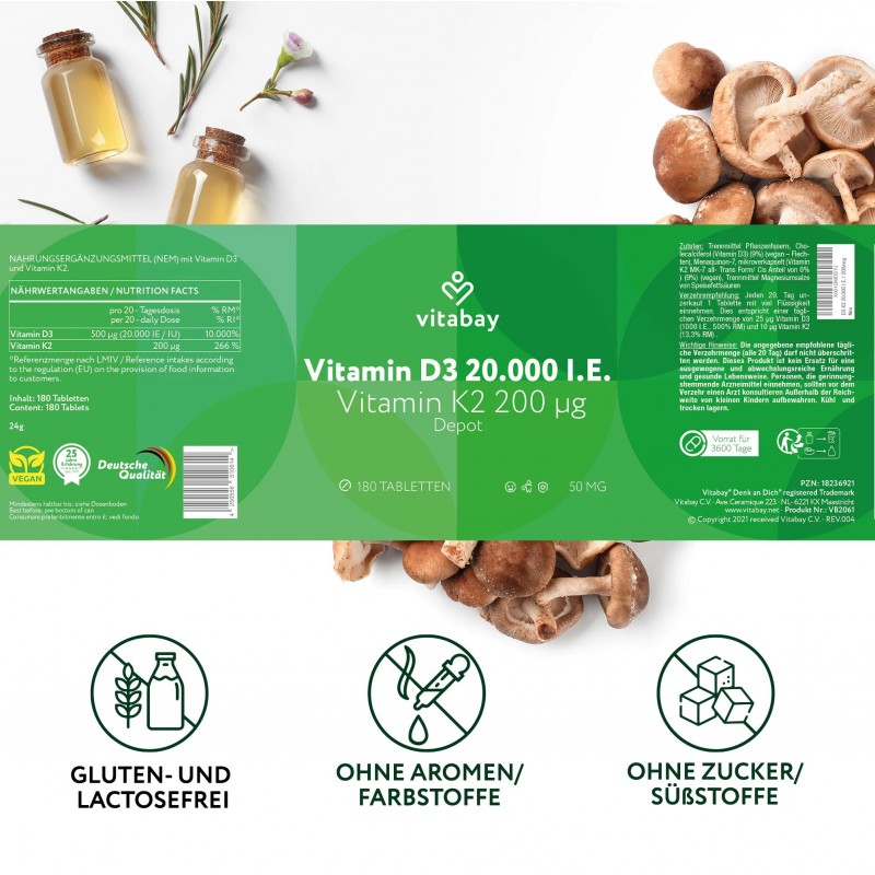 Vitamina D3 20,000 IU + K2 (MK7) Beneficii Intareste-ti corpul cu vitamina D3 vitala. Protejeaza oasele si dintii, va intareste sistemul imunitar si va optimizeaza miscarile musculare. Combinat cu vitamina K2, este deosebit de eficient. Fabricat in Germania la cele mai inalte standarde de calitate, doar cel mai bun pentru corpul tau! Amestec in doza mare de Vitamina D3 si K2 20.000 UI (500 µg) Vitamina D3 si 200 µg Vitamina K2 per capsula: pentru reumplerea rapida a proviziilor de vitamina D din organism. VITAMINA D Vitamina D3 se gaseste in natura aproape exclusiv in surse animale si in special in peste, produse lactate, oua si carne. Plantele, cum ar fi lichenii si diverse ciuperci, contin doar cantitati foarte mici de vitamina D2, mult mai putin eficienta. Vitamina D joaca un rol foarte important. Este una dintre putinele vitamine care nu este absorbita direct din alimente, ci mai degraba produsa de celulele pielii din lumina soarelui. Nu este o vitamina in sensul traditional al cuvantului, ci mai degraba un pro-hormon. Spre deosebire de multe alte vitamine, vitamina D este transformata intr-un hormon important care regleaza functionarea celulelor si procesele corporale. Aproape toate celulele corpului au receptori speciali pentru hormonul vitaminei D, care depind de aportul suficient. Vitamina D si vitamina K2 sunt cofactori in reglarea metabolismului calciului. Impreuna, cele doua vitamine controleaza formarea si descompunerea celulelor osoase si importante molecule de transport care asigura utilizarea corecta a calciului. Sunday Natural Vitamin D3 si K2 MK7 combina cei doi nutrienti intr-un raport care asigura o sinergie optima. Vitamina D este inca cercetata intens. Noi mecanisme de actiune ale acestei vitamine fascinante sunt descoperite aproape in fiecare an. Pana acum, UE (EFSA) a facut publice urmatoarele declaratii privind vitamina D: Vitamina D contribuie la: Absorbtia si utilizarea normala a calciului si fosforului Niveluri normale de calciu din sange Intretinerea oaselor Mentinerea functiei musculare normale Mentinerea dintilor sanatosi Functia normala a sistemului imunitar Vitamina D are o functie in diviziunea celulara. VITAMINA K Vitamina K exista in natura ca vitamina K1 (filochinona) si vitamina K2 (menachinona), vitamina K2 parand a fi cea mai activa dintre cele doua forme. Filochinona se gaseste in principal in plante, in timp ce menachinona este produsa de unele bacterii intestinale umane sau este prezenta in alimentele fermentate de microorganisme, cum ar fi varza murata sau preparatul japonez natto. Vitamina K2 In organism, vitamina K2 activeaza o serie de proteine specifice care joaca roluri in procese metabolice importante, inclusiv transportul si utilizarea calciului, coagularea sangelui, reglarea diviziunii celulare, diferentierea celulelor, migrarea celulelor si procesele cruciale de reparare in diferite vase si organe. In prezent, aproape toate autoritatile de reglementare nu separa in mod specific vitamina K2, ci mai degraba iau in considerare toate vitaminele din grupul K in mod colectiv. Ca urmare, declaratiile aprobate pentru Vitamina K1 se aplica si vitaminei K2. Vitamina K contribuie la: Coagularea normala a sangelui Mentinerea oaselor normale Original Vitamina K2 MK7 all-trans Vitamina K2 exista in diferite forme, care au toate niveluri diferite de eficacitate. Vitamina K2 MK7 este acum recunoscuta drept cea mai puternica forma de K2. Cu toate acestea, exista diferente semnificative chiar si intre diferitele substante ale vitaminei K2 MK7 datorita variatiilor in structura moleculara a vitaminei, inclusiv izomerii cis si trans ai vitaminei K2. Se crede ca numai forma trans a vitaminei K2 poate fi utilizata de organism. Vitamina K2 este una dintre putinele substante de pe piata care poate garanta 100% din MK7 all-trans extrem de eficient pentru continutul declarat de vitamina K2, asigurata printr-un test de laborator specializat efectuat. Vitamina K2 si Vitamina D Vitamina K2 este partenerul principal al vitaminei D in reglarea metabolismului calciului. Impreuna, aceste doua vitamine guverneaza celulele care formeaza oasele si cele care resorb oasele, precum si moleculele vitale de transport care asigura utilizarea adecvata a calciului. Mod administrare: Luati 1 comprimat vegan intreg cu mult lichid la fiecare 20 de zile. Aceasta corespunde unui consum zilnic de 25 mcg Vitamina D3 (1000 UI, 500% VNR) si 10 mcg vitamina K2 (13,3% VNR). Ingrediente Agent antiaglomerant fibre vegetale, colecaliferol (vitamina D3) (licheni vegan), menachinona-7, microincapsulat (vitamina K2 MK-7 all - forma trans) (vegan) , agent antiaglomerant saruri de magneziu ale acizilor grasi. Vitamina D3 20,000 ui + K2 contraindicatii: Nu luati acest produs daca sunteti insarcinata sau alaptati. A nu se lasa la indemana copiilor. Nu utilizati daca sigiliul este rupt. A se pastra intr-un loc racoros si uscat. Nu folositi un supliment alimentar ca inlocuitor al unei alimentatii variate si echilibrate! Acest supliment alimentar nu este destinat sa diagnosticheze, sa trateze, sa vindece sau sa previna vreo boala.