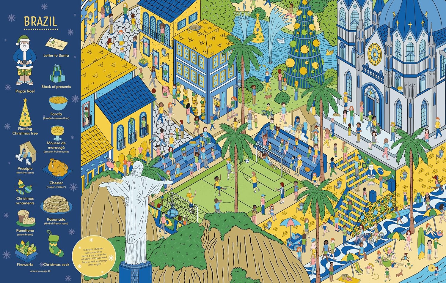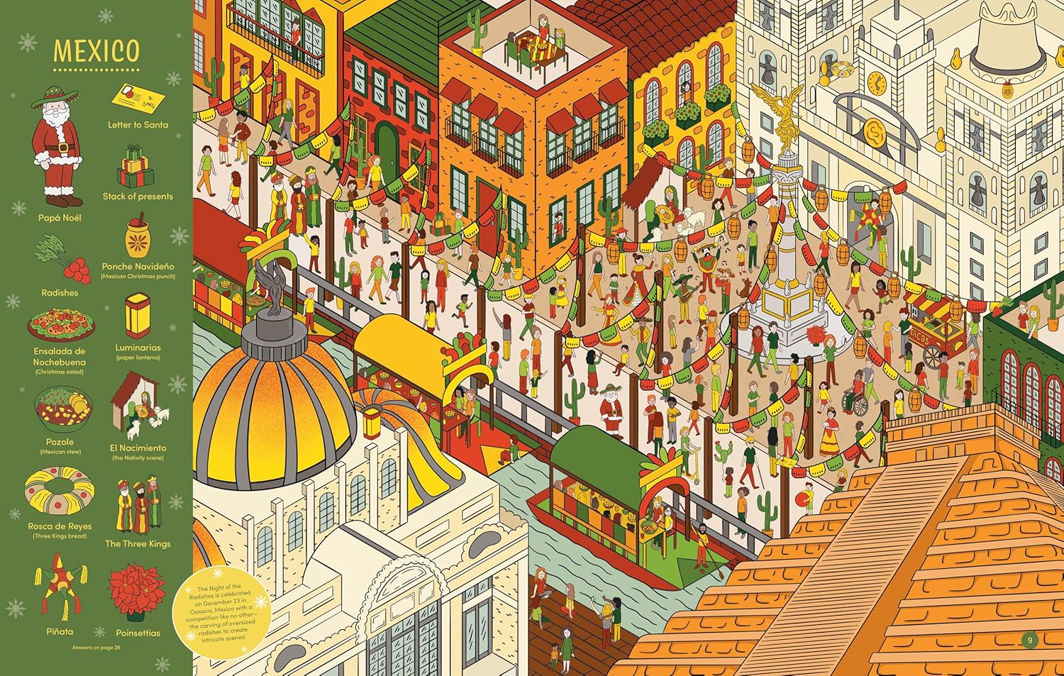 Where in the world is Santa Claus? Peruse the vibrant Christmas-themed scenes from across the globe to find holiday-inspired items and even Santa Claus himself!Bring the spirit of Christmas to life with Where’s Santa? Filled with fun and festive scenes featuring Santa Claus, elves, presents, and more, explore Christmas around the world with this delightful activity book where every page is a jolly new adventure. Look for Santa and Christmas-inspired items from each country, including:USACanadaMexicoBrazilEnglandGermanyIndiaJapanAustraliaSouth AfricaAnd more!A fun and interactive way to celebrate the holiday, enjoy the magic of the season as you look through each puzzle and find facts about how Christmas is recognized across the world. A fantastic stocking stuffer, gift, or winter-break activity, Where’s Santa? offers countless hours of fun.Let the search for holiday magic begin!