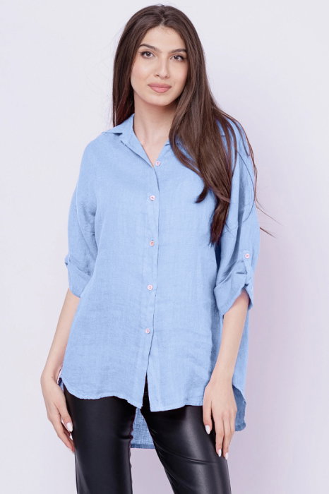 Camasa clasica din in cu buzunar pe piept si maneca 3 4, bleumarin