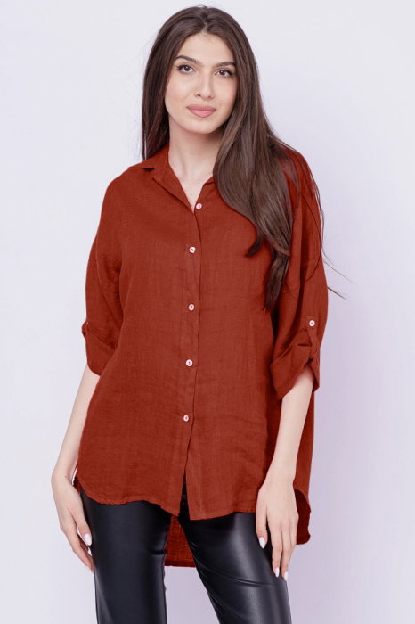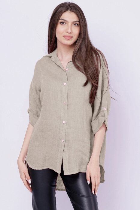 Camasa clasica din in cu buzunar pe piept si maneca 3 4, kaki