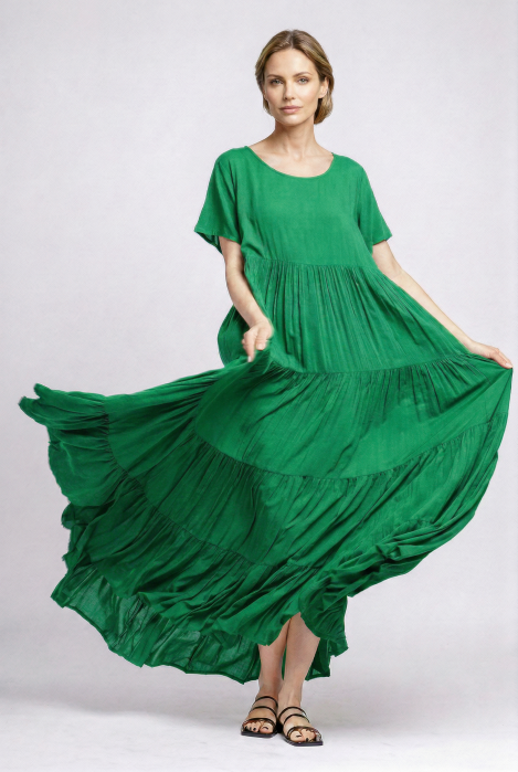 Rochie lunga verde, cu croi amplu si patru volane, stil boem elegant