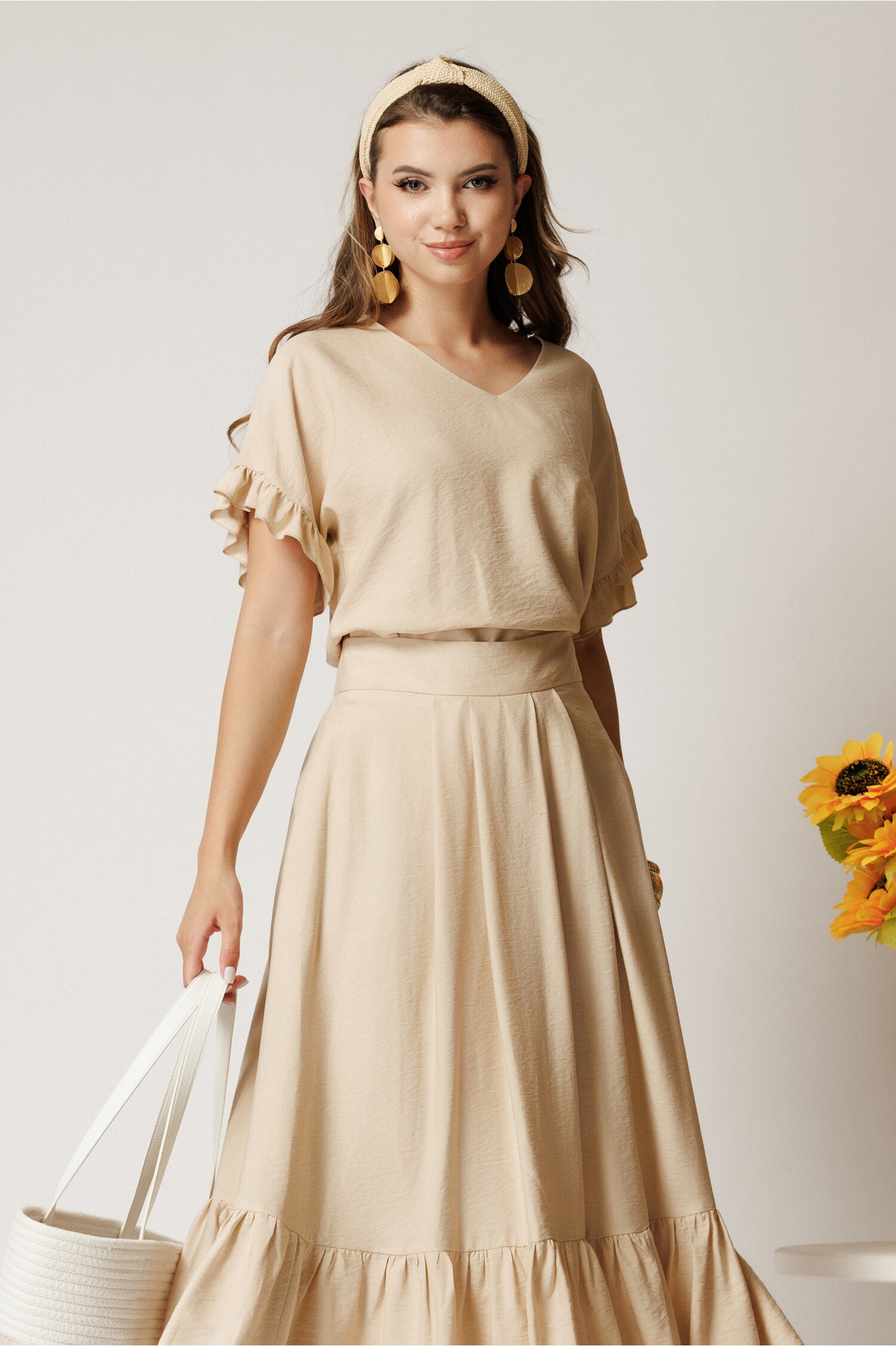 Compleu bej din doua piese cu pantaloni lejeri si bluza cu decolteu si cordon in talie
