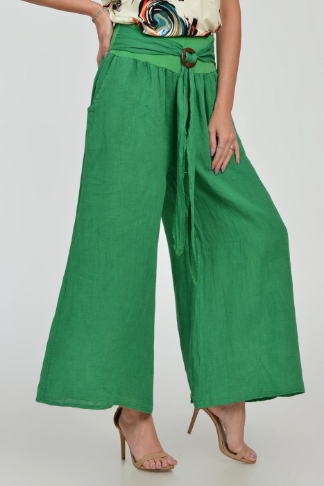 Pantaloni drepi, largi, de vara, din in, cu accesoriu de lemn, verzi