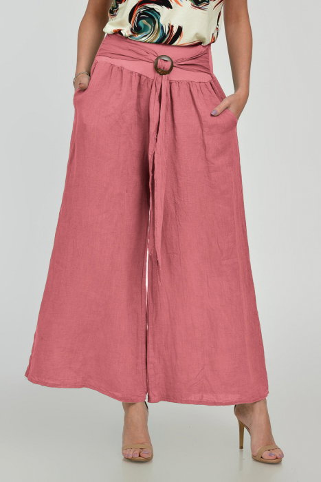 Pantaloni drepi, largi, de vara, din in, cu accesoriu de lemn, roz inchis