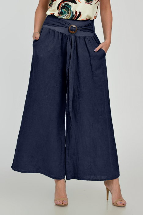 Pantaloni drepi, largi, de vara, din in, cu accesoriu de lemn, bleumarin